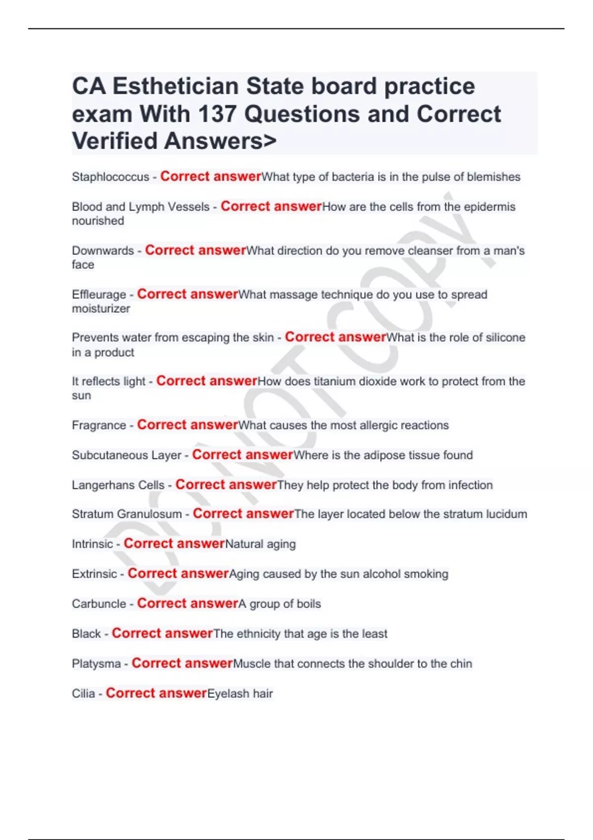 CA Esthetician State board practice exam With 137 Questions and Correct Verified AnswersCA Esthetician State board practice exam With 137 Questions and Correct Verified AnswersCA Esthetician State board practice exam With 137 Questions and Correct Verified Answers