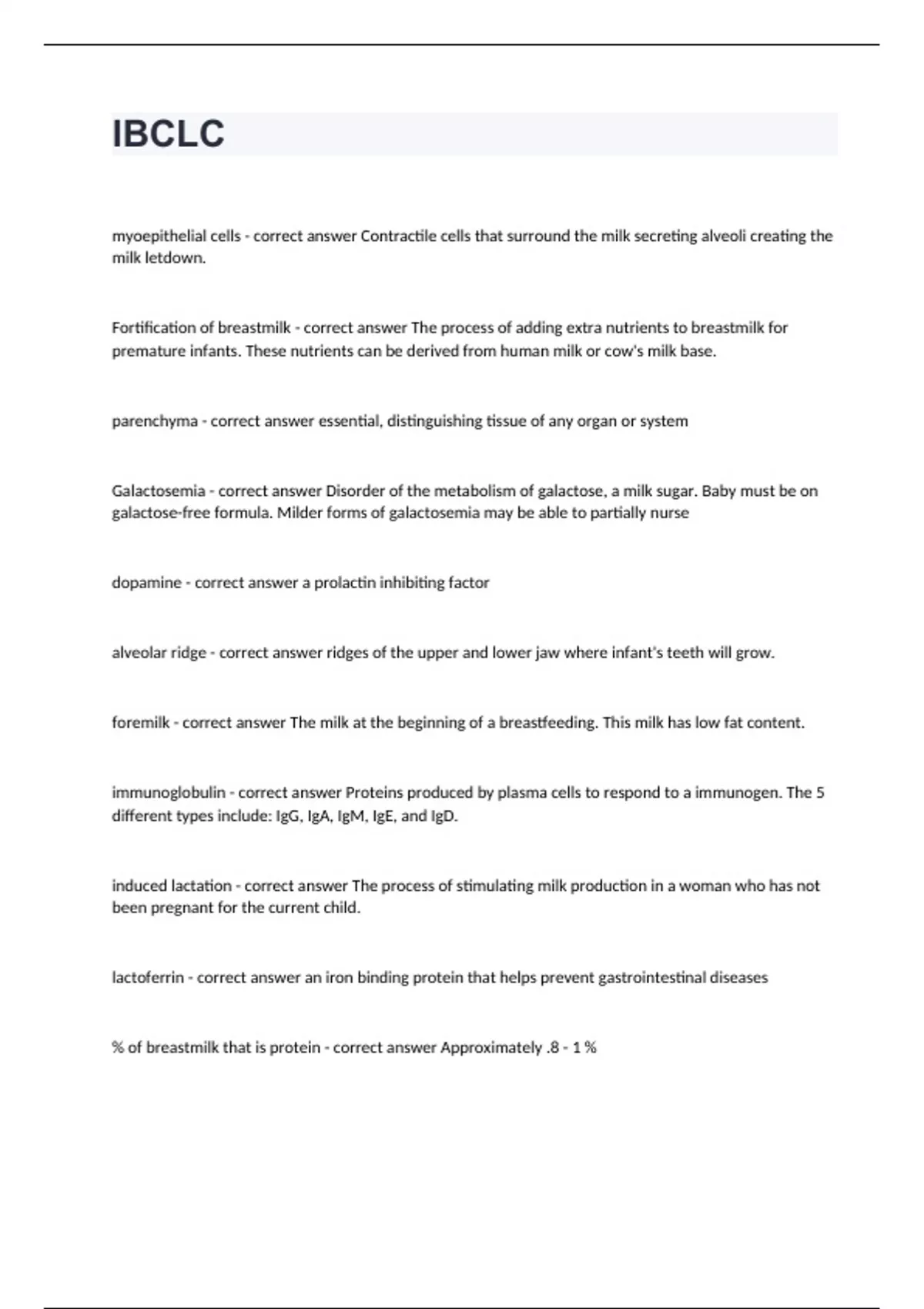 IBCLCmyoepithelial cells - correct answer Contractile cells that surround the milk secreting alveoli creating the milk letdown. Fortification of breastmilk - correct answer The process of adding extra nutrients to breastmilk for premature infants. These nutrients can be derived from human milk or cow's milk base. parenchyma - correct answer essential, distinguishing tissue of any organ or system Galactosemia - correct answer Disorder of the metabolism of galactose, a milk sugar. Baby must be on galactose-free formula. Milder forms of galactosemia may be able to partially nurse dopamine - correct answer a prolactin inhibiting factor alveolar ridge - correct answer ridges of the upper and lower jaw where infant's teeth will grow. foremilk - correct answer The milk at the beginning of a breastfeeding. This milk has low fat content. immunoglobulin - correct answer Proteins produced by plasma cells to respond to a immunogen. The 5 different types include: IgG, IgA, IgM, IgE, and IgD. induced lactation - correct answer The process of stimulating milk production in a woman who has not been pregnant for the current child. lactoferrin - correct answer an iron binding protein that helps prevent gastrointestinal diseases % of breastmilk that is protein - correct answer Approximately .8 - 1 %