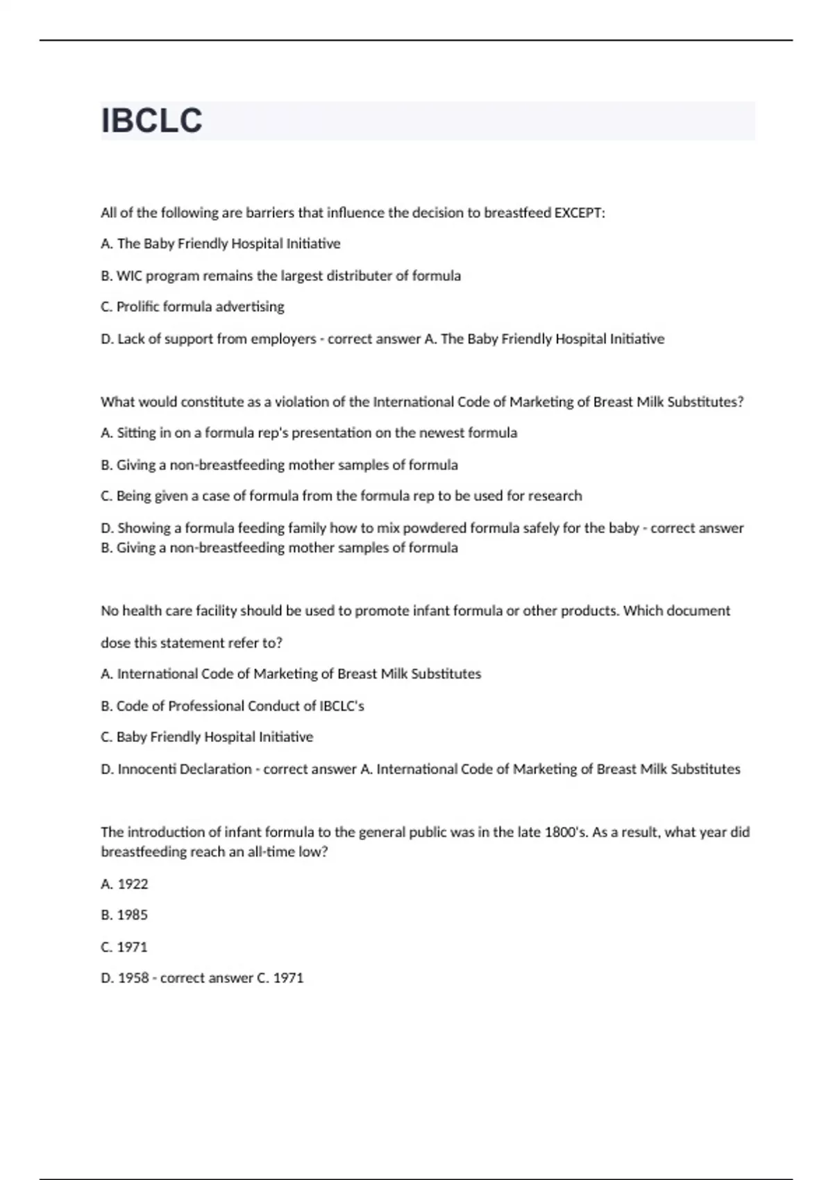 IBCLCAll of the following are barriers that influence the decision to breastfeed EXCEPT: A. The Baby Friendly Hospital Initiative B. WIC program remains the largest distributer of formula C. Prolific formula advertising D. Lack of support from employers - correct answer A. The Baby Friendly Hospital Initiative What would constitute as a violation of the International Code of Marketing of Breast Milk Substitutes? A. Sitting in on a formula rep's presentation on the newest formula B. Giving a non-breastfeeding mother samples of formula C. Being given a case of formula from the formula rep to be used for research D. Showing a formula feeding family how to mix powdered formula safely for the baby - correct answer B. Giving a non-breastfeeding mother samples of formula No health care facility should be used to promote infant formula or other products. Which document dose this statement refer to? A. International Code of Marketing of Breast Milk Substitutes B. Code of Professional Conduct of IBCLC's C. Baby Friendly Hospital Initiative D. Innocenti Declaration - correct answer A. International Code of Marketing of Breast Milk Substitutes The introduction of infant formula to the general public was in the late 1800's. As a result, what year did breastfeeding reach an all-time low? A. 1922 B. 1985 C. 1971 D. 1958 - correct answer C. 1971