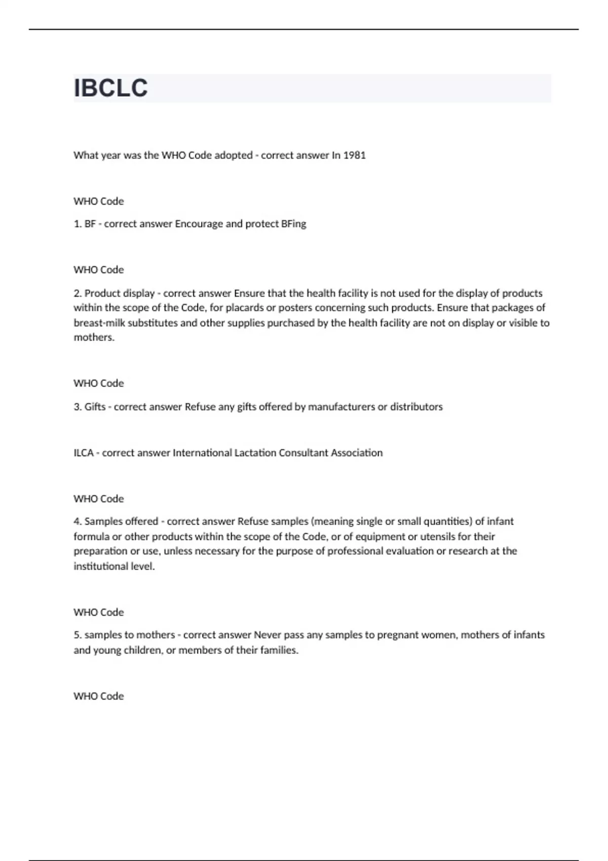 IBCLCWhat year was the WHO Code adopted - correct answer In 1981 WHO Code 1. BF - correct answer Encourage and protect BFing WHO Code 2. Product display - correct answer Ensure that the health facility is not used for the display of products within the scope of the Code, for placards or posters concerning such products. Ensure that packages of breast-milk substitutes and other supplies purchased by the health facility are not on display or visible to mothers. WHO Code 3. Gifts - correct answer Refuse any gifts offered by manufacturers or distributors ILCA - correct answer International Lactation Consultant Association WHO Code 4. Samples offered - correct answer Refuse samples (meaning single or small quantities) of infant formula or other products within the scope of the Code, or of equipment or utensils for their preparation or use, unless necessary for the purpose of professional evaluation or research at the institutional level. WHO Code 5. samples to mothers - correct answer Never pass any samples to pregnant women, mothers of infants and young children, or members of their families. WHO Code