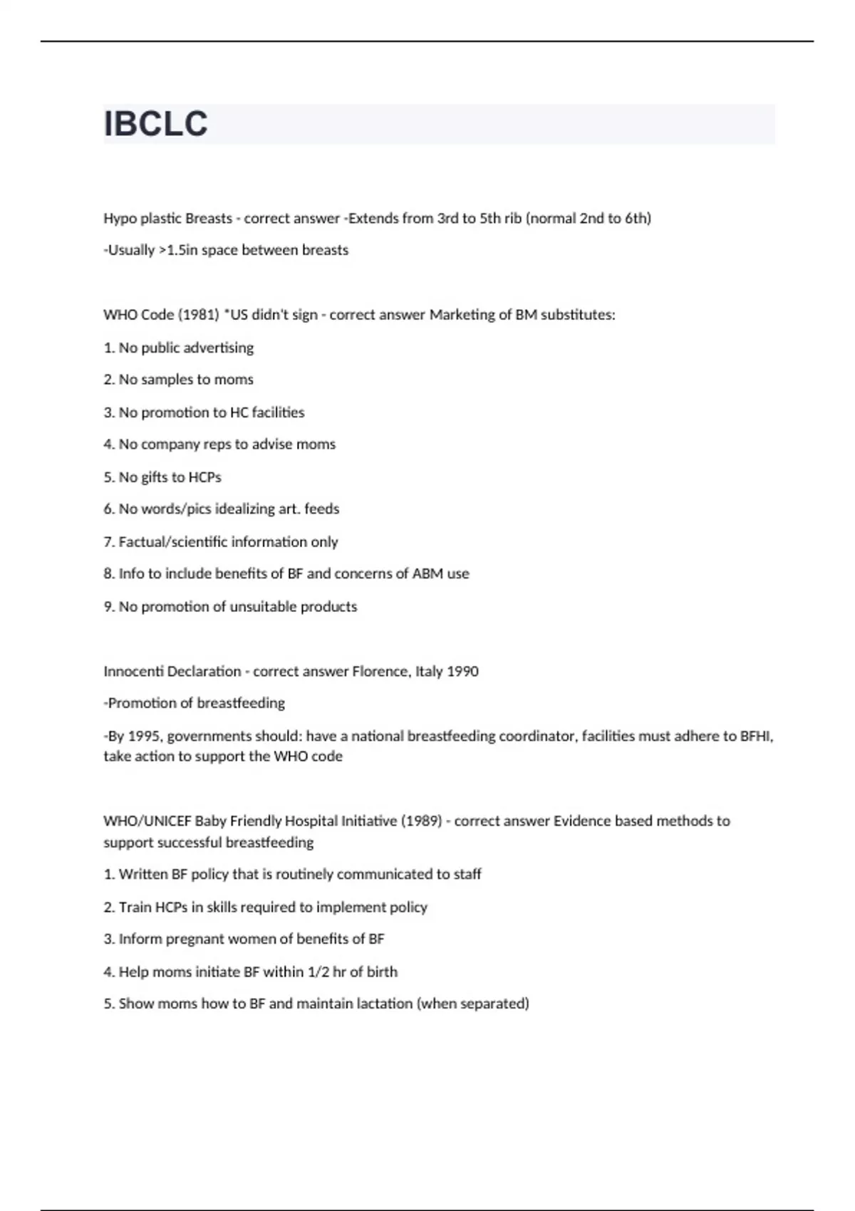 IBCLCHypo plastic Breasts - correct answer -Extends from 3rd to 5th rib (normal 2nd to 6th) -Usually >1.5in space between breasts WHO Code (1981) *US didn't sign - correct answer Marketing of BM substitutes: 1. No public advertising 2. No samples to moms 3. No promotion to HC facilities 4. No company reps to advise moms 5. No gifts to HCPs 6. No words/pics idealizing art. feeds 7. Factual/scientific information only 8. Info to include benefits of BF and concerns of ABM use 9. No promotion of unsuitable products Innocenti Declaration - correct answer Florence, Italy 1990 -Promotion of breastfeeding -By 1995, governments should: have a national breastfeeding coordinator, facilities must adhere to BFHI, take action to support the WHO code WHO/UNICEF Baby Friendly Hospital Initiative (1989) - correct answer Evidence based methods to support successful breastfeeding 1. Written BF policy that is routinely communicated to staff 2. Train HCPs in skills required to implement policy 3. Inform pregnant women of benefits of BF 4. Help moms initiate BF within 1/2 hr of birth 5. Show moms how to BF and maintain lactation (when separated)