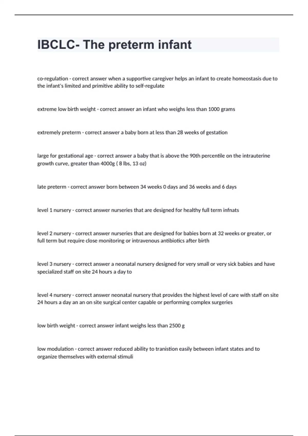 IBCLC- The preterm infantco-regulation - correct answer when a supportive caregiver helps an infant to create homeostasis due to the infant's limited and primitive ability to self-regulate extreme low birth weight - correct answer an infant who weighs less than 1000 grams extremely preterm - correct answer a baby born at less than 28 weeks of gestation large for gestational age - correct answer a baby that is above the 90th percentile on the intrauterine growth curve, greater than 4000g ( 8 lbs, 13 oz) late preterm - correct answer born between 34 weeks 0 days and 36 weeks and 6 days level 1 nursery - correct answer nurseries that are designed for healthy full term infnats level 2 nursery - correct answer nurseries that are designed for babies born at 32 weeks or greater, or full term but require close monitoring or intravenous antibiotics after birth level 3 nursery - correct answer a neonatal nursery designed for very small or very sick babies and have specialized staff on site 24 hours a day to level 4 nursery - correct answer neonatal nursery that provides the highest level of care with staff on site 24 hours a day an an on site surgical center capable or performing complex surgeries low birth weight - correct answer infant weighs less than 2500 g low modulation - correct answer reduced ability to tranistion easily between infant states and to organize themselves with external stimuli