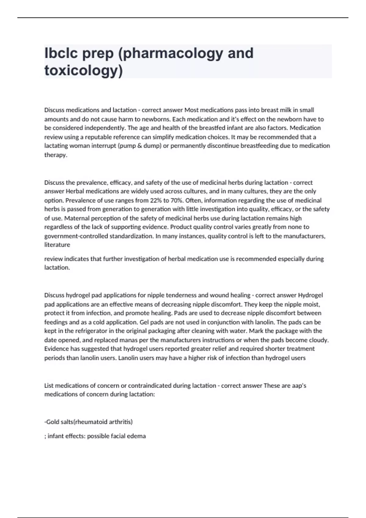 Ibclc prep (pharmacology and toxicology)questions and answers graded A+ 2024/2025