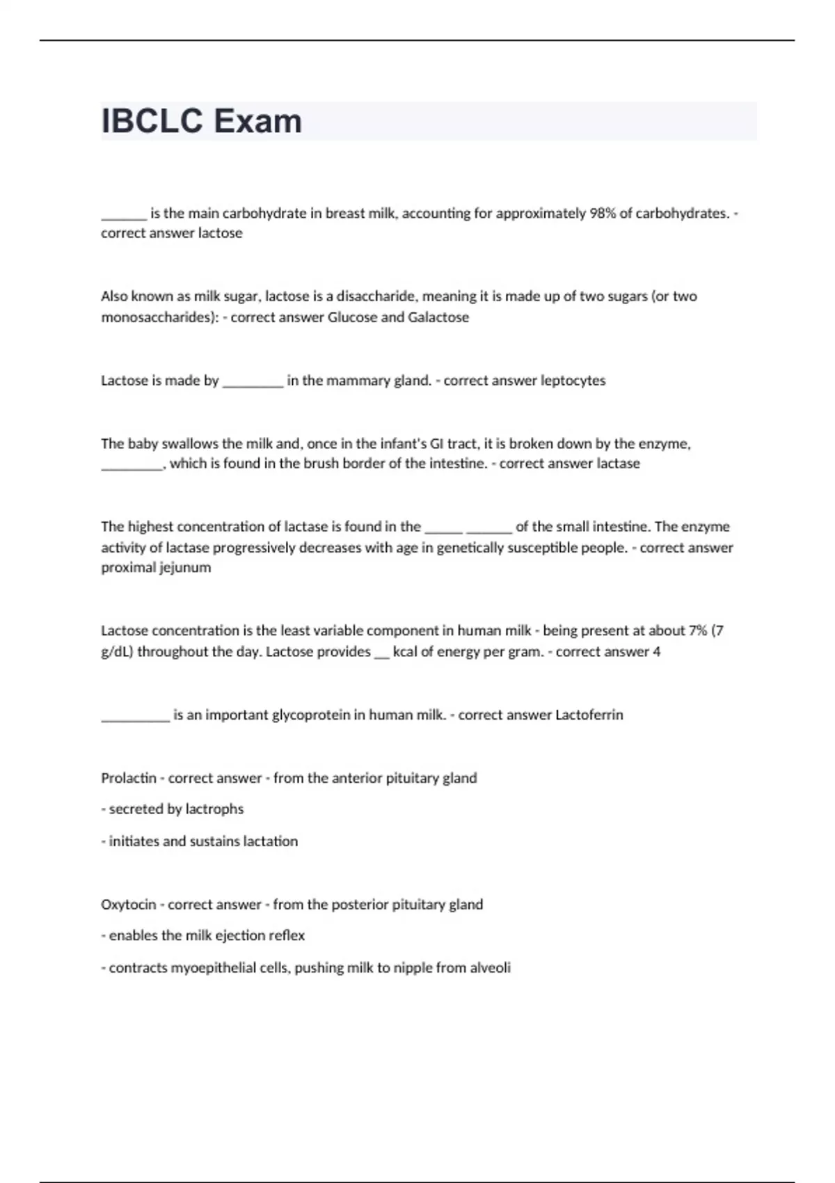 IBCLC Exam______ is the main carbohydrate in breast milk, accounting for approximately 98% of carbohydrates. - correct answer lactose Also known as milk sugar, lactose is a disaccharide, meaning it is made up of two sugars (or two monosaccharides): - correct answer Glucose and Galactose Lactose is made by ________ in the mammary gland. - correct answer leptocytes The baby swallows the milk and, once in the infant's GI tract, it is broken down by the enzyme, ________, which is found in the brush border of the intestine. - correct answer lactase The highest concentration of lactase is found in the _____ ______ of the small intestine. The enzyme activity of lactase progressively decreases with age in genetically susceptible people. - correct answer proximal jejunum Lactose concentration is the least variable component in human milk - being present at about 7% (7 g/dL) throughout the day. Lactose provides __ kcal of energy per gram. - correct answer 4 _________ is an important glycoprotein in human milk. - correct answer Lactoferrin Prolactin - correct answer - from the anterior pituitary gland - secreted by lactrophs - initiates and sustains lactation Oxytocin - correct answer - from the posterior pituitary gland - enables the milk ejection reflex - contracts myoepithelial cells, pushing milk to nipple from alveoli A problem with this facial nerve can cause Bell's Palsy: - correct answer VII facial/cranial nerve (7th