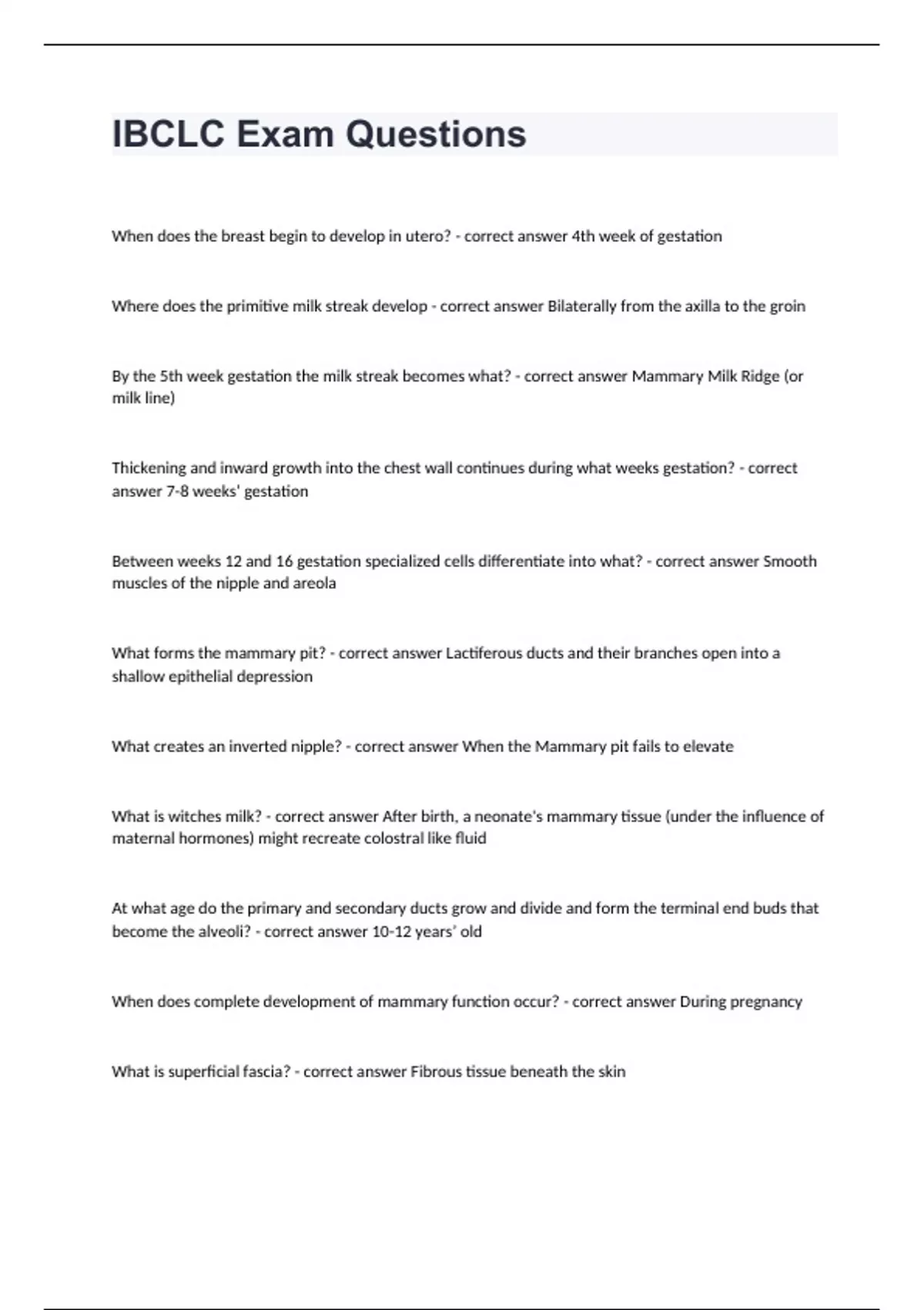 IBCLC Exam QuestionsWhen does the breast begin to develop in utero? - correct answer 4th week of gestation Where does the primitive milk streak develop - correct answer Bilaterally from the axilla to the groin By the 5th week gestation the milk streak becomes what? - correct answer Mammary Milk Ridge (or milk line) Thickening and inward growth into the chest wall continues during what weeks gestation? - correct answer 7-8 weeks’ gestation Between weeks 12 and 16 gestation specialized cells differentiate into what? - correct answer Smooth muscles of the nipple and areola What forms the mammary pit? - correct answer Lactiferous ducts and their branches open into a shallow epithelial depression What creates an inverted nipple? - correct answer When the Mammary pit fails to elevate What is witches milk? - correct answer After birth, a neonate's mammary tissue (under the influence of maternal hormones) might recreate colostral like fluid At what age do the primary and secondary ducts grow and divide and form the terminal end buds that become the alveoli? - correct answer 10-12 years’ old When does complete development of mammary function occur? - correct answer During pregnancy What is superficial fascia? - correct answer Fibrous tissue beneath the skin