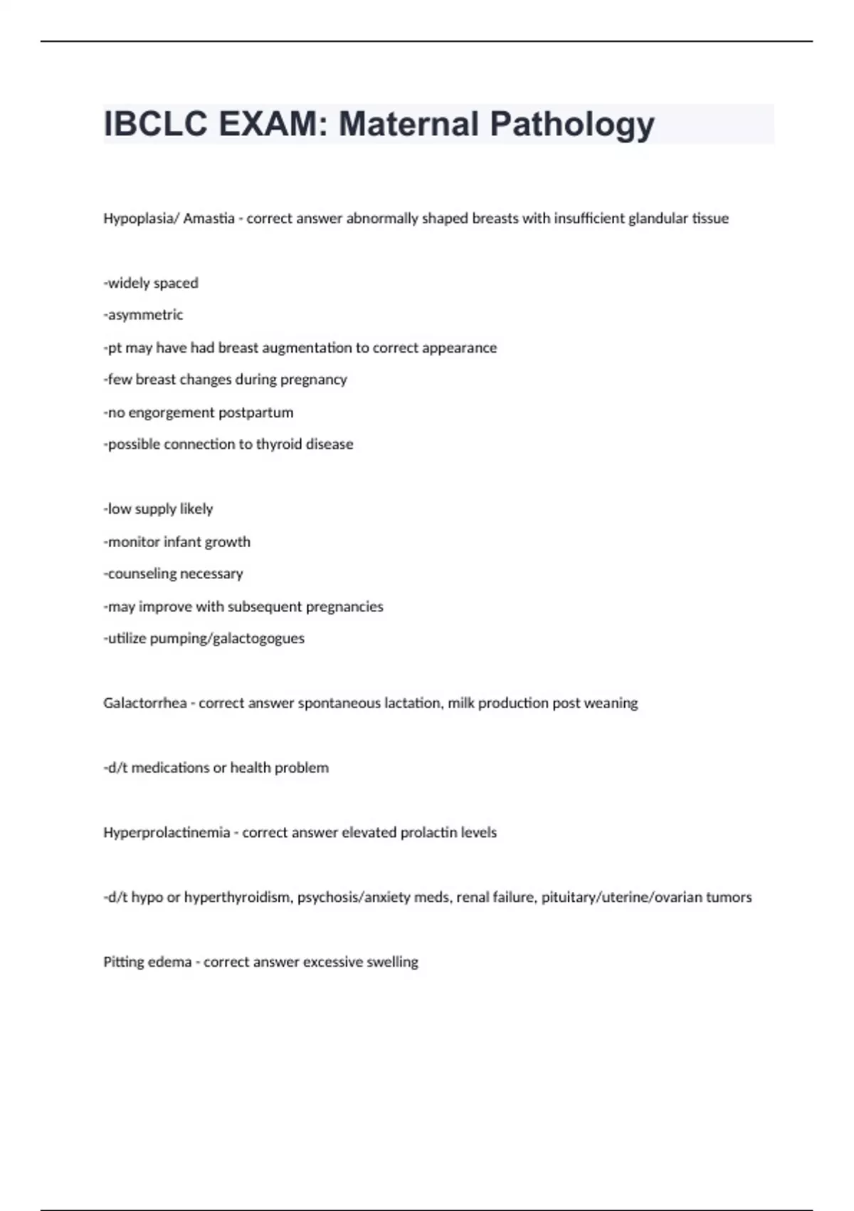 IBCLC EXAM: Maternal PathologyHypoplasia/ Amastia - correct answer abnormally shaped breasts with insufficient glandular tissue -widely spaced -asymmetric -pt may have had breast augmentation to correct appearance -few breast changes during pregnancy -no engorgement postpartum -possible connection to thyroid disease -low supply likely -monitor infant growth -counseling necessary -may improve with subsequent pregnancies -utilize pumping/galactogogues Galactorrhea - correct answer spontaneous lactation, milk production post weaning -d/t medications or health problem Hyperprolactinemia - correct answer elevated prolactin levels -d/t hypo or hyperthyroidism, psychosis/anxiety meds, renal failure, pituitary/uterine/ovarian tumors Pitting edema - correct answer excessive swelling