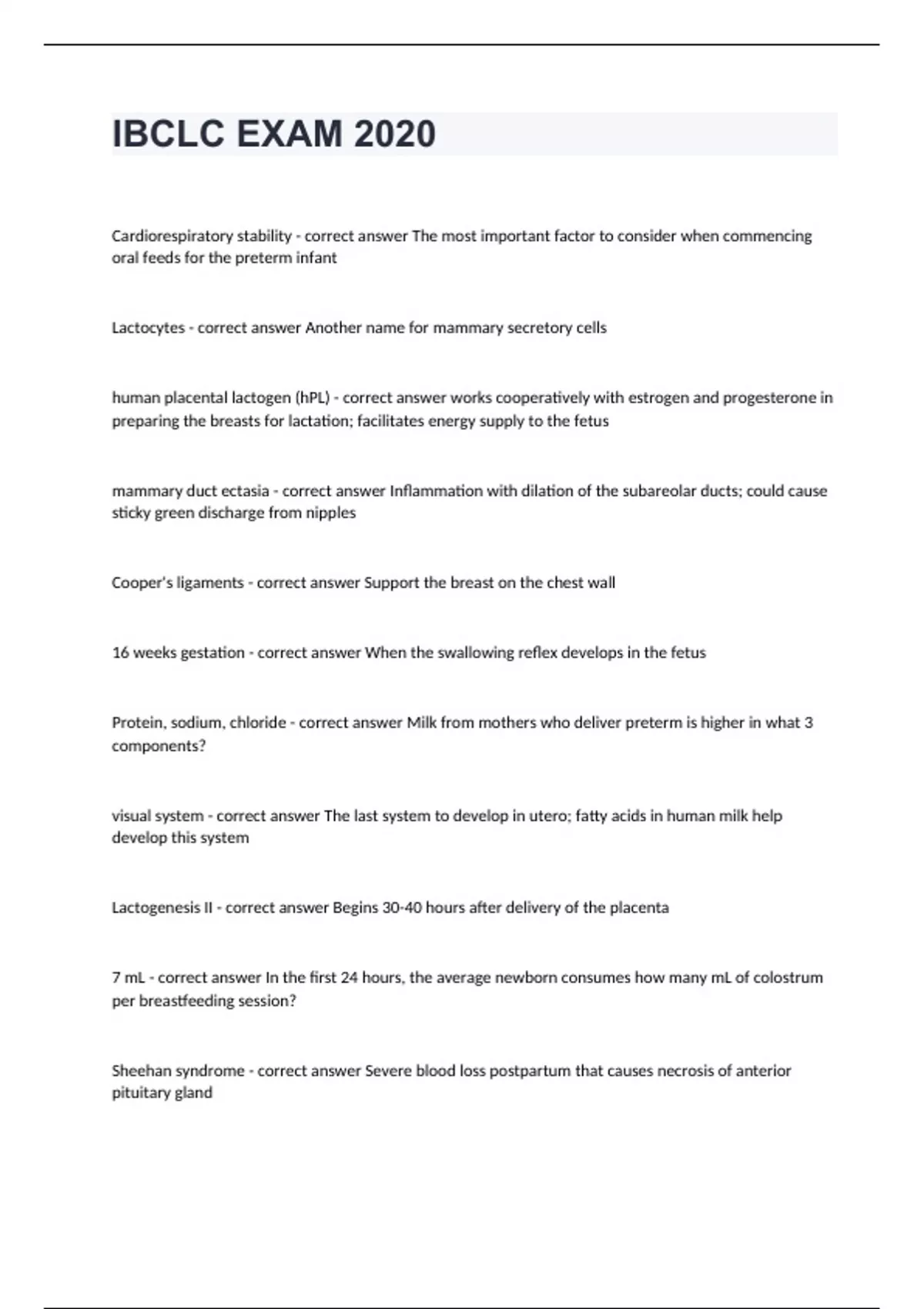 IBCLC EXAM 2020 Cardiorespiratory stability - correct answer The most important factor to consider when commencing oral feeds for the preterm infant Lactocytes - correct answer Another name for mammary secretory cells human placental lactogen (hPL) - correct answer works cooperatively with estrogen and progesterone in preparing the breasts for lactation; facilitates energy supply to the fetus mammary duct ectasia - correct answer Inflammation with dilation of the subareolar ducts; could cause sticky green discharge from nipples Cooper's ligaments - correct answer Support the breast on the chest wall 16 weeks gestation - correct answer When the swallowing reflex develops in the fetus Protein, sodium, chloride - correct answer Milk from mothers who deliver preterm is higher in what 3 components? visual system - correct answer The last system to develop in utero; fatty acids in human milk help develop this system Lactogenesis II - correct answer Begins 30-40 hours after delivery of the placenta 7 mL - correct answer In the first 24 hours, the average newborn consumes how many mL of colostrum per breastfeeding session? Sheehan syndrome - correct answer Severe blood loss postpartum that causes necrosis of anterior pituitary gland