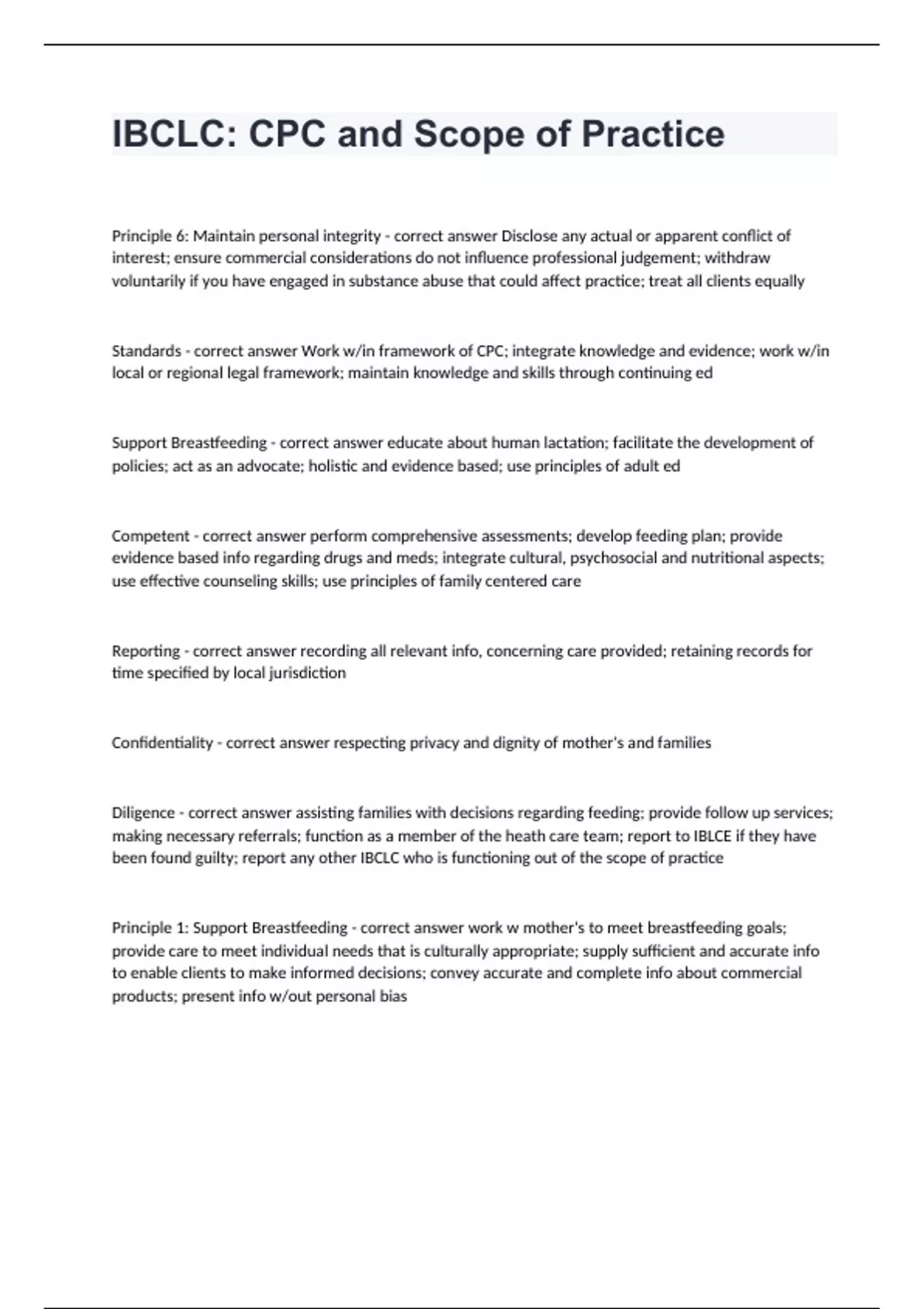 IBCLC: CPC and Scope of Practice Principle 6: Maintain personal integrity - correct answer Disclose any actual or apparent conflict of interest; ensure commercial considerations do not influence professional judgement; withdraw voluntarily if you have engaged in substance abuse that could affect practice; treat all clients equally Standards - correct answer Work w/in framework of CPC; integrate knowledge and evidence; work w/in local or regional legal framework; maintain knowledge and skills through continuing ed Support Breastfeeding - correct answer educate about human lactation; facilitate the development of policies; act as an advocate; holistic and evidence based; use principles of adult ed Competent - correct answer perform comprehensive assessments; develop feeding plan; provide evidence based info regarding drugs and meds; integrate cultural, psychosocial and nutritional aspects; use effective counseling skills; use principles of family centered care Reporting - correct answer recording all relevant info, concerning care provided; retaining records for time specified by local jurisdiction Confidentiality - correct answer respecting privacy and dignity of mother's and families Diligence - correct answer assisting families with decisions regarding feeding; provide follow up services; making necessary referrals; function as a member of the heath care team; report to IBLCE if they have been found guilty; report any other IBCLC who is functioning out of the scope of practice Principle 1: Support Breastfeeding - correct answer work w mother's to meet breastfeeding goals; provide care to meet individual needs that is culturally appropriate; supply sufficient and accurate info to enable clients to make informed decisions; convey accurate and complete info about commercial products; present info w/out personal bias