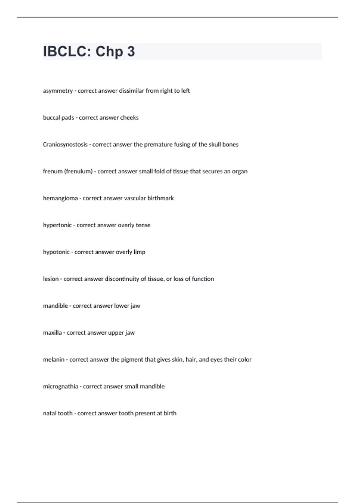 IBCLC: Chp 3asymmetry - correct answer dissimilar from right to left buccal pads - correct answer cheeks Craniosynostosis - correct answer the premature fusing of the skull bones frenum (frenulum) - correct answer small fold of tissue that secures an organ hemangioma - correct answer vascular birthmark hypertonic - correct answer overly tense hypotonic - correct answer overly limp lesion - correct answer discontinuity of tissue, or loss of function mandible - correct answer lower jaw maxilla - correct answer upper jaw melanin - correct answer the pigment that gives skin, hair, and eyes their color micrognathia - correct answer small mandible natal tooth - correct answer tooth present at birth