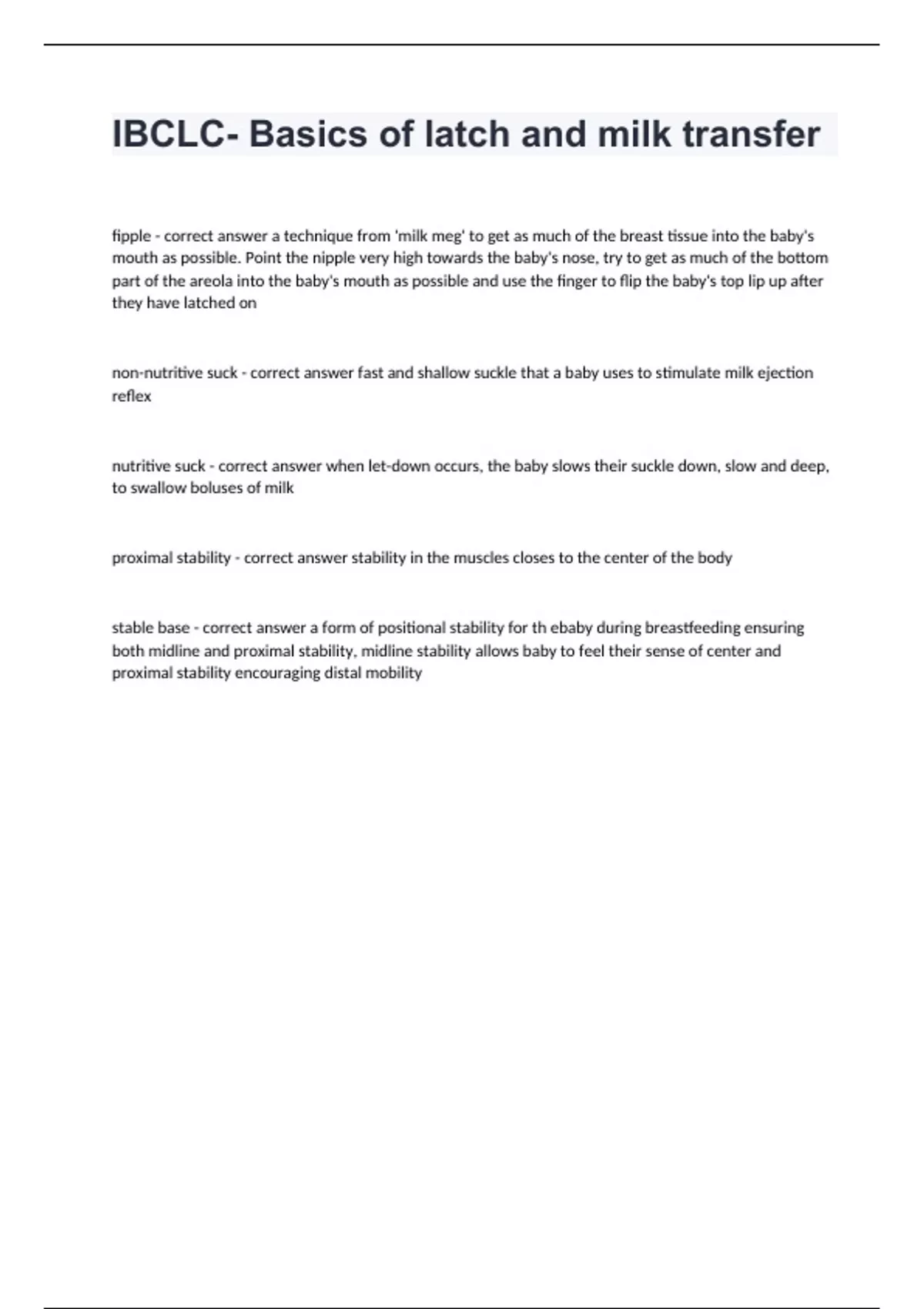 IBCLC- Basics of latch and milk transfer fipple - correct answer a technique from 'milk meg' to get as much of the breast tissue into the baby's mouth as possible. Point the nipple very high towards the baby's nose, try to get as much of the bottom part of the areola into the baby's mouth as possible and use the finger to flip the baby's top lip up after they have latched on non-nutritive suck - correct answer fast and shallow suckle that a baby uses to stimulate milk ejection reflex nutritive suck - correct answer when let-down occurs, the baby slows their suckle down, slow and deep, to swallow boluses of milk proximal stability - correct answer stability in the muscles closes to the center of the body stable base - correct answer a form of positional stability for th ebaby during breastfeeding ensuring both midline and proximal stability, midline stability allows baby to feel their sense of center and proximal stability encouraging distal mobility