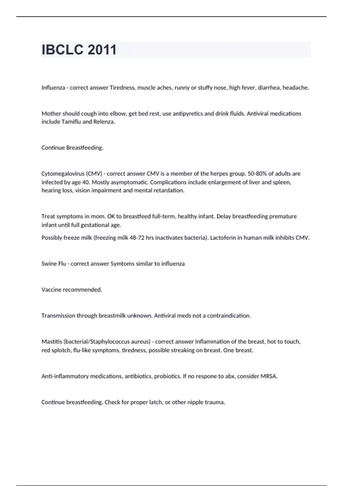 IBCLC 2011Influenza - correct answer Tiredness, muscle aches, runny or stuffy nose, high fever, diarrhea, headache. Mother should cough into elbow, get bed rest, use antipyretics and drink fluids. Antiviral medications include Tamiflu and Relenza. Continue Breastfeeding. Cytomegalovirus (CMV) - correct answer CMV is a member of the herpes group. 50-80% of adults are infected by age 40. Mostly asymptomatic. Complications include enlargement of liver and spleen, hearing loss, vision impairment and mental retardation. Treat symptoms in mom. OK to breastfeed full-term, healthy infant. Delay breastfeeding premature infant until full gestational age. Possibly freeze milk (freezing milk 48-72 hrs inactivates bacteria). Lactoferin in human milk inhibits CMV. Swine Flu - correct answer Symtoms similar to influenza Vaccine recommended. Transmission through breastmilk unknown. Antiviral meds not a contraindication. Mastitis (bacterial/Staphylococcus aureus) - correct answer Inflammation of the breast, hot to touch, red splotch, flu-like symptoms, tiredness, possible streaking on breast. One breast. Anti-inflammatory medications, antibiotics, probiotics. If no respone to abx, consider MRSA. Continue breastfeeding. Check for proper latch, or other nipple trauma. Mastitis (Strep) - correct answer Inflammation of the breast, hot to touch, red splotch, flu-like symptoms, tiredness, possible streaking on breast. Both breasts. Anti-inflammatory medications, antibiotics, probiotics. Hospitalization possible. Continue breastfeeding. Check for proper latch, or other nipple trauma. MRSA - correct answer methicillin resistant staphylococcus aureus Continue breastfeeding full-term, health infant, or pump if too painful to breastfeed directly. Breastfeeding not contraindicated if both mother and infant are MRSA+ Pre-term and ill infants should not be fed MRSA-cultured breastmilk. Mother should pump & dump. Urinary Tract Infection - correct answer Most antibiotics not contraindicated for breastfeeding. Check most recent Hales. Uterine Infections - correct answer Endometritis/Metritis. High risk from prolonged ROM, multiple cervical exams and internal fetal monitoring. Most antibiotics not contraindicated or breastfeeding. Check most recent Hales. Tuberculosis - correct answer Inactive TB: OK to breastfeed. Active TB: Do not breastfeed until treatment has been established for 14 days. Infant should be seperated from mother during this time. Mother may pump. No seperation necessary if baby is already infected. Group A Streptococcal (Strep Throat) - correct answer Transmission through direct contact and respiratory droplets.