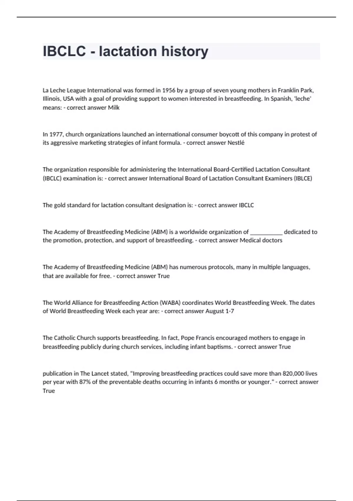 IBCLC - lactation historyLa Leche League International was formed in 1956 by a group of seven young mothers in Franklin Park, Illinois, USA with a goal of providing support to women interested in breastfeeding. In Spanish, 'leche' means: - correct answer Milk In 1977, church organizations launched an international consumer boycott of this company in protest of its aggressive marketing strategies of infant formula. - correct answer Nestlé The organization responsible for administering the International Board-Certified Lactation Consultant (IBCLC) examination is: - correct answer International Board of Lactation Consultant Examiners (IBLCE) The gold standard for lactation consultant designation is: - correct answer IBCLC The Academy of Breastfeeding Medicine (ABM) is a worldwide organization of __________ dedicated to the promotion, protection, and support of breastfeeding. - correct answer Medical doctors The Academy of Breastfeeding Medicine (ABM) has numerous protocols, many in multiple languages, that are available for free. - correct answer True The World Alliance for Breastfeeding Action (WABA) coordinates World Breastfeeding Week. The dates of World Breastfeeding Week each year are: - correct answer August 1-7 The Catholic Church supports breastfeeding. In fact, Pope Francis encouraged mothers to engage in breastfeeding publicly during church services, including infant baptisms. - correct answer True publication in The Lancet stated, "Improving breastfeeding practices could save more than 820,000 lives per year with 87% of the preventable deaths occurring in infants 6 months or younger." - correct answer True