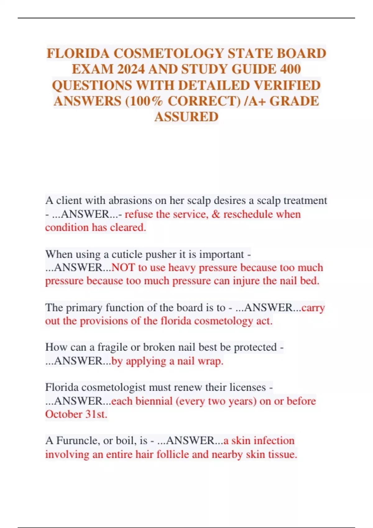 FLORIDA COSMETOLOGY STATE BOARD EXAM 2024 AND STUDY GUIDE 400 QUESTIONS WITH DETAILED VERIFIED ANSWERS (100% CORRECT) /A+ GRADE ASSURED