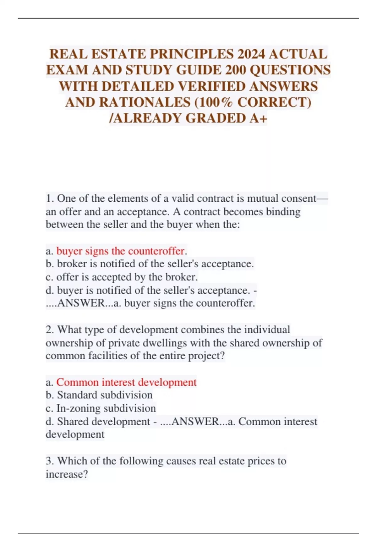 REAL ESTATE PRINCIPLES 2024 ACTUAL EXAM AND STUDY GUIDE 200 QUESTIONS WITH DETAILED VERIFIED ANSWERS AND RATIONALES (100% CORRECT) /ALREADY GRADED A+