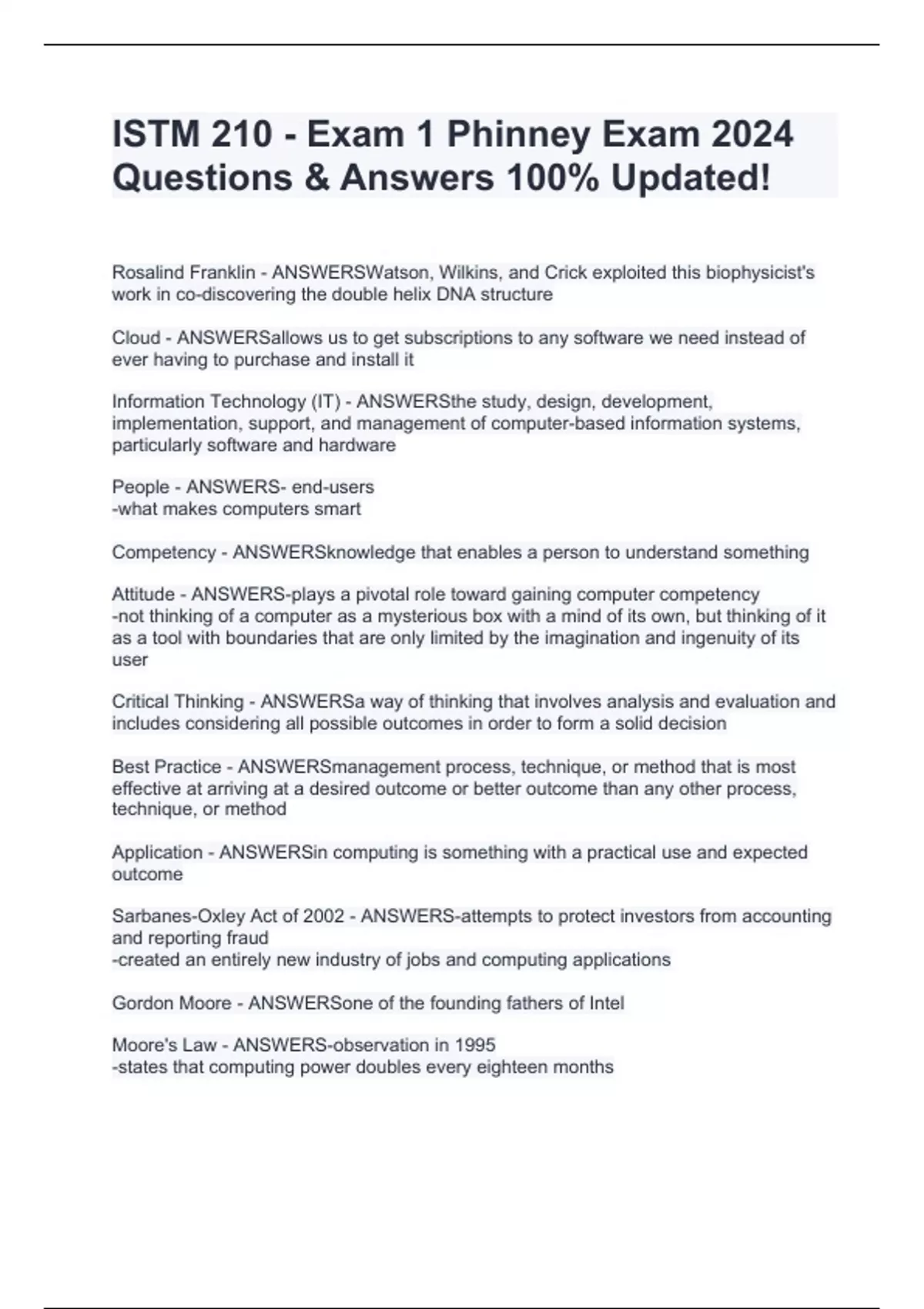 Rosalind Franklin - ANSWERSWatson, Wilkins, and Crick exploited this biophysicist's work in co-discovering the double helix DNA structure Cloud - ANSWERSallows us to get subscriptions to any software we need instead of ever having to purchase and install it Information Technology (IT) - ANSWERSthe study, design, development, implementation, support, and management of computer-based information systems, particularly software and hardware People - ANSWERS- end-users -what makes computers smart Competency - ANSWERSknowledge that enables a person to understand something Attitude - ANSWERS-plays a pivotal role toward gaining computer competency -not thinking of a computer as a mysterious box with a mind of its own, but thinking of it as a tool with boundaries that are only limited by the imagination and ingenuity of its user Critical Thinking - ANSWERSa way of thinking that involves analysis and evaluation and includes considering all possible outcomes in order to form a solid decision Best Practice - ANSWERSmanagement process, technique, or method that is most effective at arriving at a desired outcome or better outcome than any other process, technique, or method Application - ANSWERSin computing is something with a practical use and expected outcome Sarbanes-Oxley Act of 2002 - ANSWERS-attempts to protect investors from accounting and reporting fraud -created an entirely new industry of jobs and computing applications Gordon Moore - ANSWERSone of the founding fathers of Intel Moore's Law - ANSWERS-observation in 1995 -states that computing power doubles every eighteen months