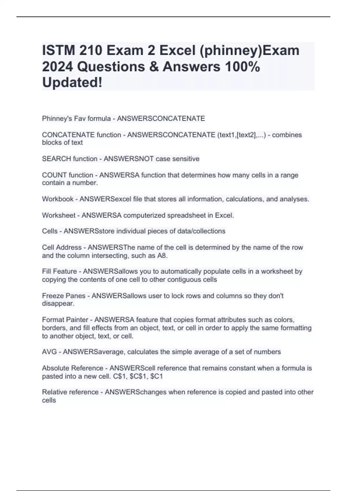 ISTM 210 Exam 2 Excel (phinney)Exam 2024 Questions & Answers 100% Updated!