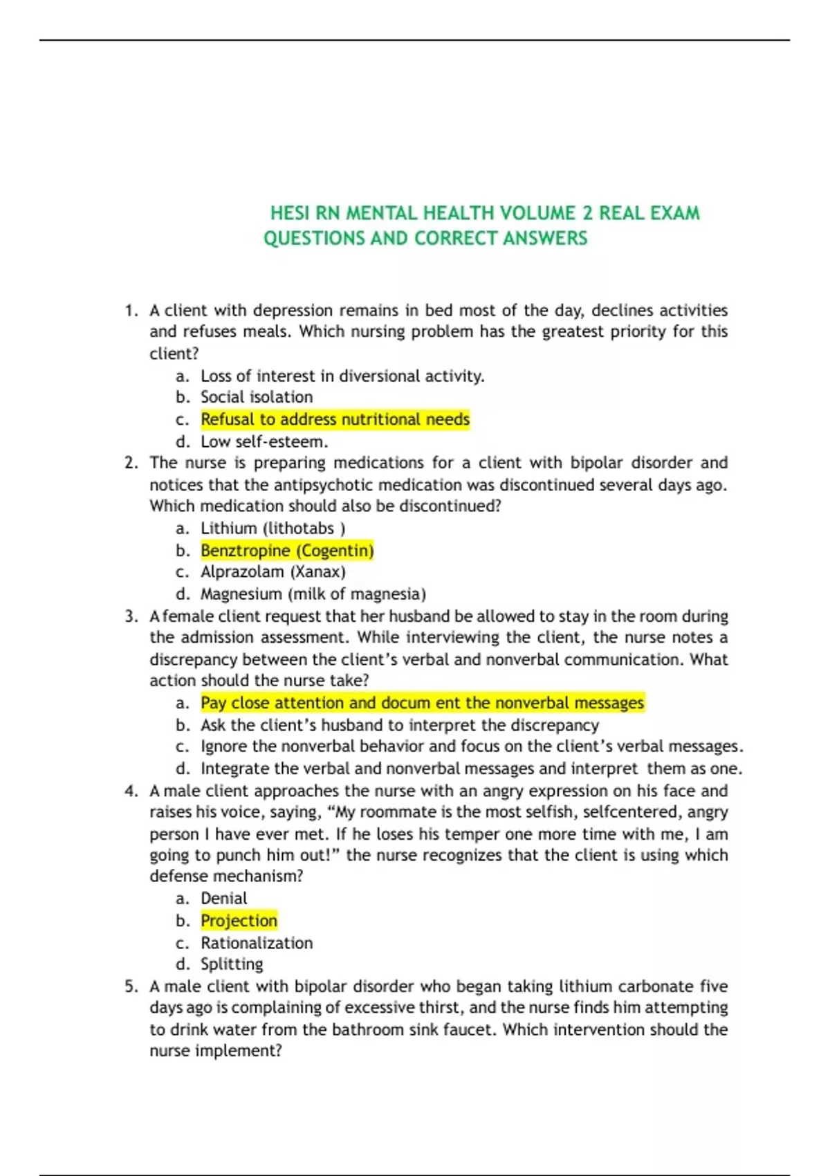 HESI RN MENTAL HEALTH VOLUME 2 REAL EXAM QUESTIONS AND CORRECT ANSWERS