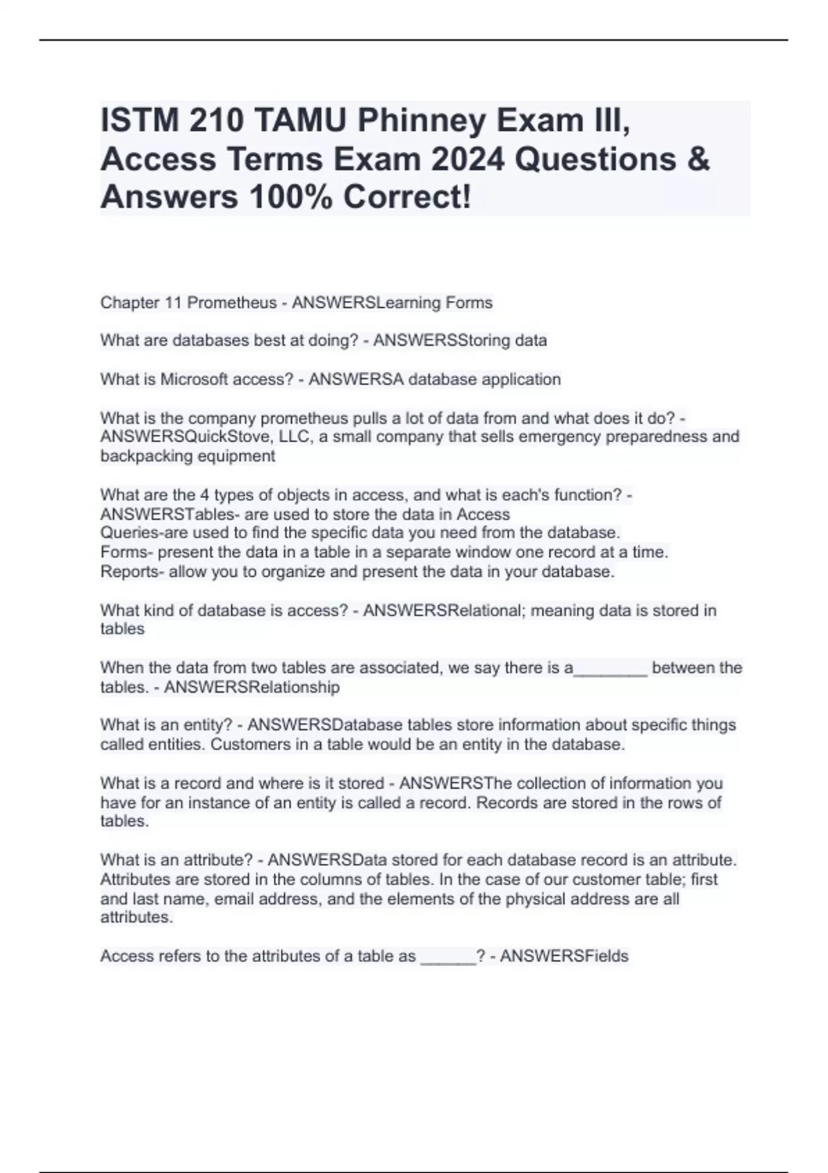 ISTM 210 TAMU Phinney Exam III, Access Terms Exam 2024 Questions & Answers 100% Correct!