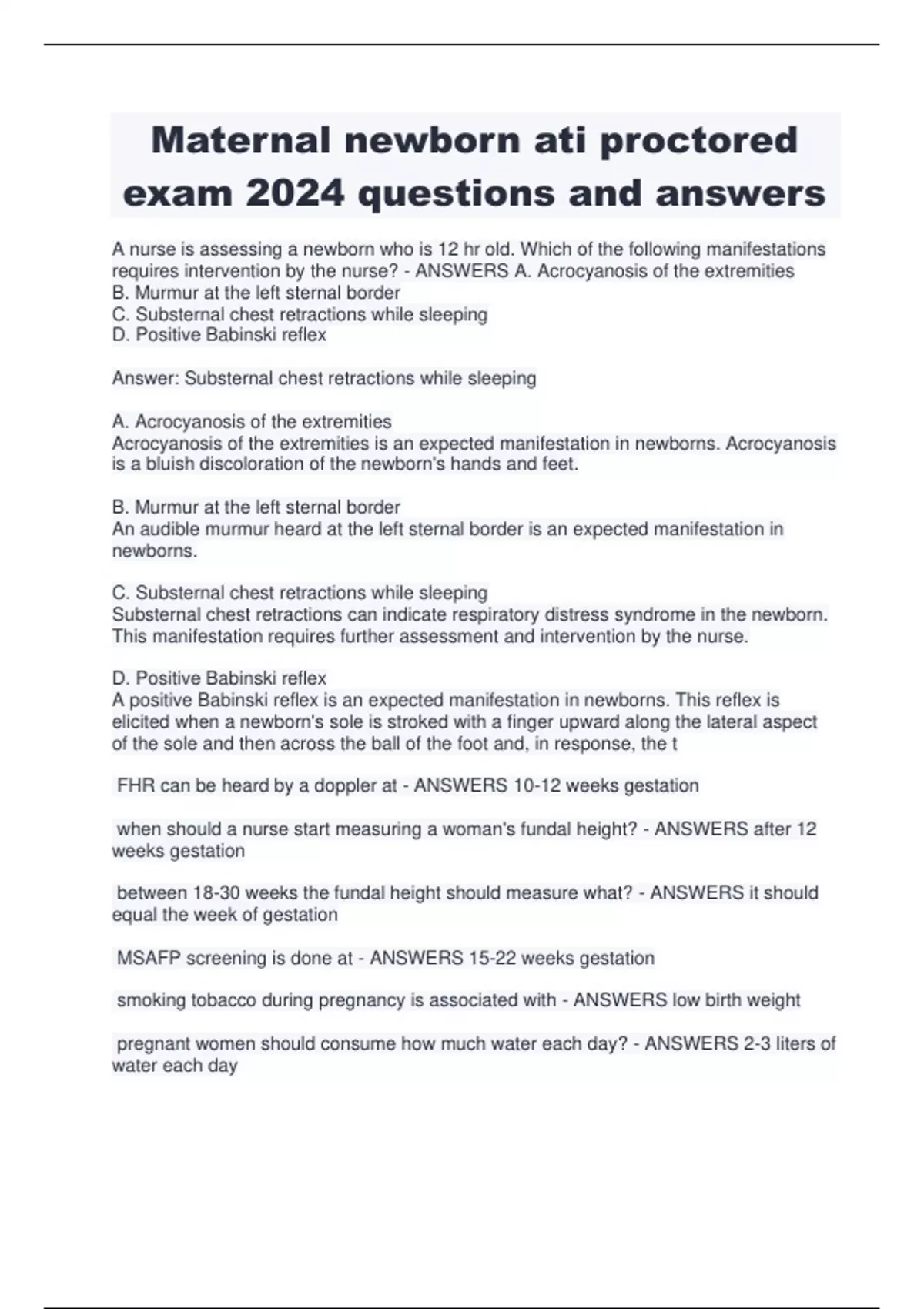 Maternal newborn ati proctored exam 2024 questions and answers A nurse is assessing a newborn who is 12 hr old. Which of the following manifestations requires intervention by the nurse? - ANSWERS A. Acrocyanosis of the extremities B. Murmur at the left sternal border C. Substernal chest retractions while sleeping D. Positive Babinski reflex Answer: Substernal chest retractions while sleeping A. Acrocyanosis of the extremities Acrocyanosis of the extremities is an expected manifestation in newborns. Acrocyanosis is a bluish discoloration of the newborn's hands and feet. B. Murmur at the left sternal border An audible murmur heard at the left sternal border is an expected manifestation in newborns. C. Substernal chest retractions while sleeping Substernal chest retractions can indicate respiratory distress syndrome in the newborn. This manifestation requires further assessment and intervention by the nurse. D. Positive Babinski reflex A positive Babinski reflex is an expected manifestation in newborns. This reflex is elicited when a newborn's sole is stroked with a finger upward along the lateral aspect of the sole and then across the ball of the foot and, in response, the t FHR can be heard by a doppler at - ANSWERS 10-12 weeks gestation when should a nurse start measuring a woman's fundal height? - ANSWERS after 12 weeks gestation between 18-30 weeks the fundal height should measure what? - ANSWERS it should equal the week of gestation MSAFP screening is done at - ANSWERS 15-22 weeks gestation smoking tobacco during pregnancy is associated with - ANSWERS low birth weight pregnant women should consume how much water each day? - ANSWERS 2-3 liters of water each day regarding kick counts what are the signs the woman needs further evaluation? - ANSWERS there are less than 3 kicks in one hour or there are no signs of fetal movement for 12 hours recommended weight gain during pregnancy - ANSWERS 25-30 pounds, 3-4 pounds first trimester and 1 pound per week last two trimesters foods high in folic acid - ANSWERS leafy greens, dried peas, dried beans, seeds, orange juice recommended amount of folic acid intake during pregnancy - ANSWERS 600 mcg recommended folic acid intake for lactating pregnant women - ANSWERS 500 mcg what vitamin increases absorption of iron - ANSWERS vitamin c client's bladder needs to be ____ before an ultrasound - ANSWERS full BPP normal score - ANSWERS 8-10 BPP abnormal score - ANSWERS less than 4 if a BPP comes back as a 6 - ANSWERS it should be retested BPP assesses for - ANSWERS fetal well being non stress test (NST) - ANSWERS assesses fetal well being during third trimester reactive NST - ANSWERS normal FHR baseline with moderate variability and two accelerations 15 beats per minute for at least 15 seconds over 20 minute period non reactive NST indicates - ANSWERS FHR did not accelerate adequately with fetal movement positive contraction stress test (CST) is - ANSWERS abnormal and indicates late decelerations on more than half of the contractions when is amniocentesis is performed - ANSWERS after 14 weeks gestation AFP can be measured from amniotic fluid between - ANSWERS 16-18 weeks PG on fetal lung test indicates - ANSWERS respiratory distress CVS can be done at - ANSWERS 10-12 weeks gestation when can a quad screen be done - ANSWERS 15-20 weeks gestation MSAFP can be done when - ANSWERS 16-18 weeks gestation amniocentesis requires the bladder to be - ANSWERS empty labor occurs ___ hours after ROM - ANSWERS 24 hours first stage of labor - ANSWERS 1-1.5 cm latent phase of labor - ANSWERS 0-3 cm, mild to moderate contractions q5-30 min lasting 30-40 seconds active phase of labor - ANSWERS 4-7 cm, moderate to strong contractions q3-5 min lasting 40-70 seconds transition phase of labor - ANSWERS 8-10 cm, strong contractions q2-3 min lasting 45- 90 seconds second stage of labor - ANSWERS birth third stage of labor - ANSWERS delivery of placenta fourth stage of labor - ANSWERS stabilization of vital signs first four hours postpartum minimal variability - ANSWERS less than 5 contractions per min moderate variability - ANSWERS 6-25 contra