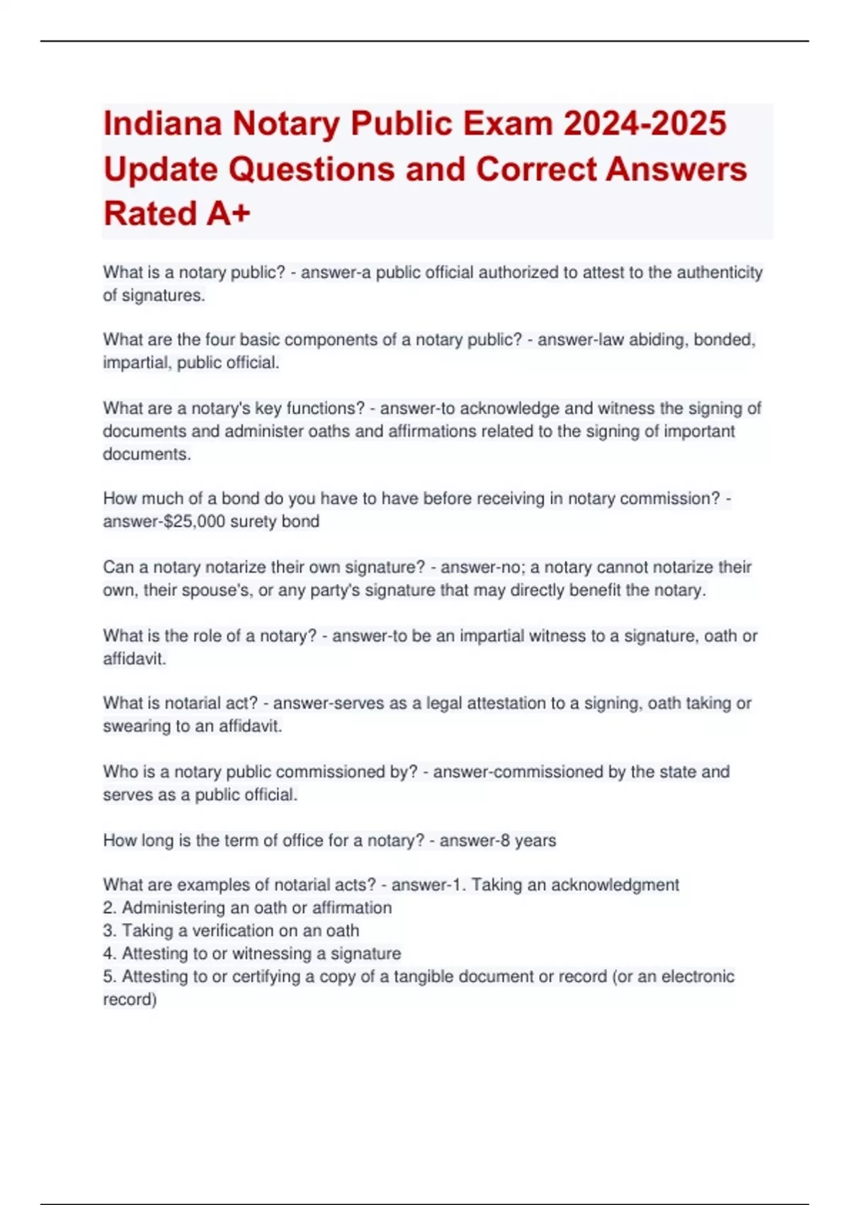 Indiana Notary Public Exam Update Questions and Correct Answers Rated A+