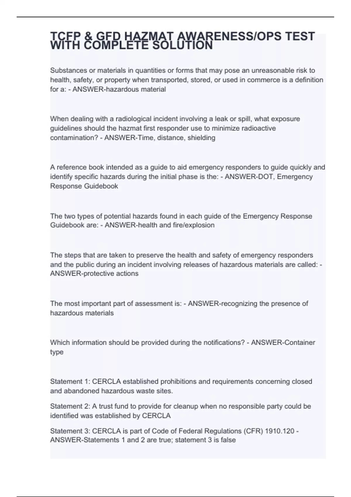 Substances or materials in quantities or forms that may pose an unreasonable risk to health, safety, or property when transported, stored, or used in commerce is a definition for a: - ANSWER-hazardous material When dealing with a radiological incident involving a leak or spill, what exposure guidelines should the hazmat first responder use to minimize radioactive contamination? - ANSWER-Time, distance, shielding A reference book intended as a guide to aid emergency responders to guide quickly and identify specific hazards during the initial phase is the: - ANSWER-DOT, Emergency Response Guidebook The two types of potential hazards found in each guide of the Emergency Response Guidebook are: - ANSWER-health and fire/explosion The steps that are taken to preserve the health and safety of emergency responders and the public during an incident involving releases of hazardous materials are called: - ANSWER-protective actions The most important part of assessment is: - ANSWER-recognizing the presence of hazardous materials Which information should be provided during the notifications? - ANSWER-Container type Statement 1: CERCLA established prohibitions and requirements concerning closed and abandoned hazardous waste sites. Statement 2: A trust fund to provide for cleanup when no responsible party could be identified was established by CERCLA