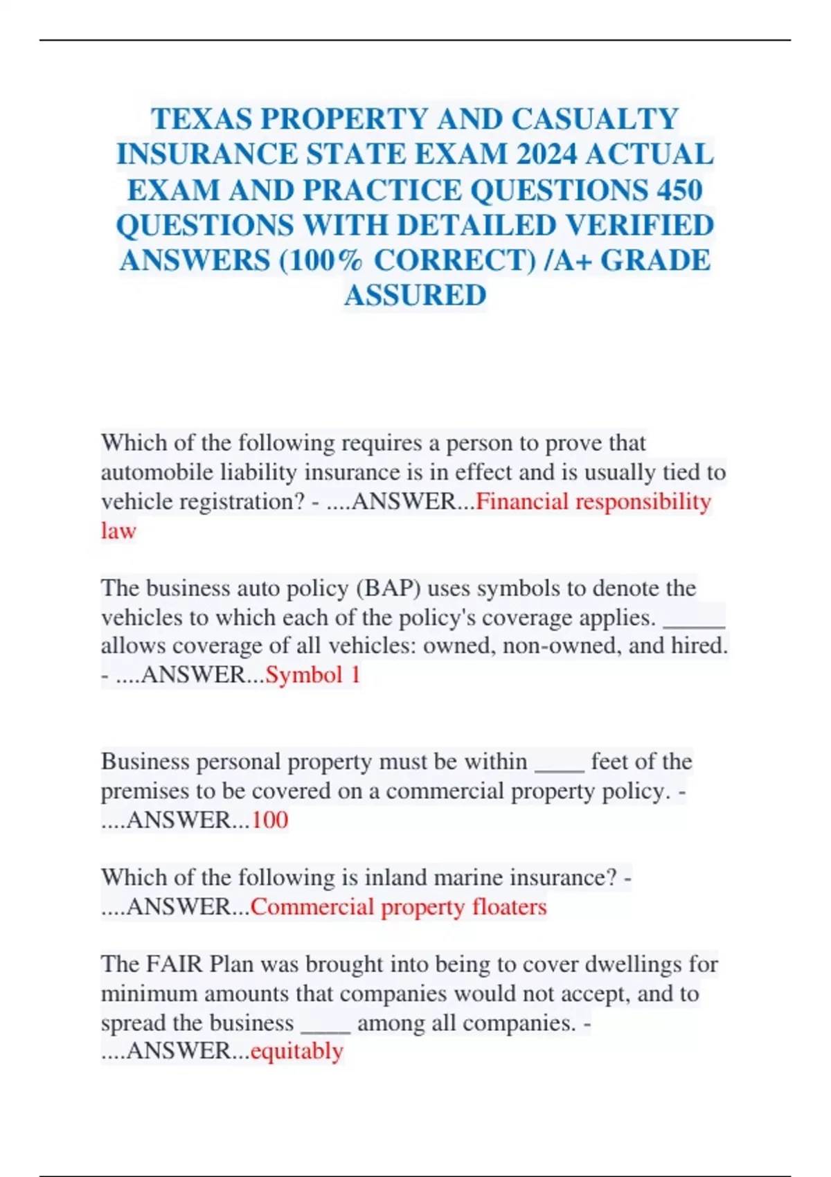 TEXAS PROPERTY AND CASUALTY INSURANCE STATE EXAM 2024 ACTUAL EXAM AND PRACTICE QUESTIONS 450 QUESTIONS WITH DETAILED VERIFIED ANSWERS (100% CORRECT) /A+ GRADE ASSURED