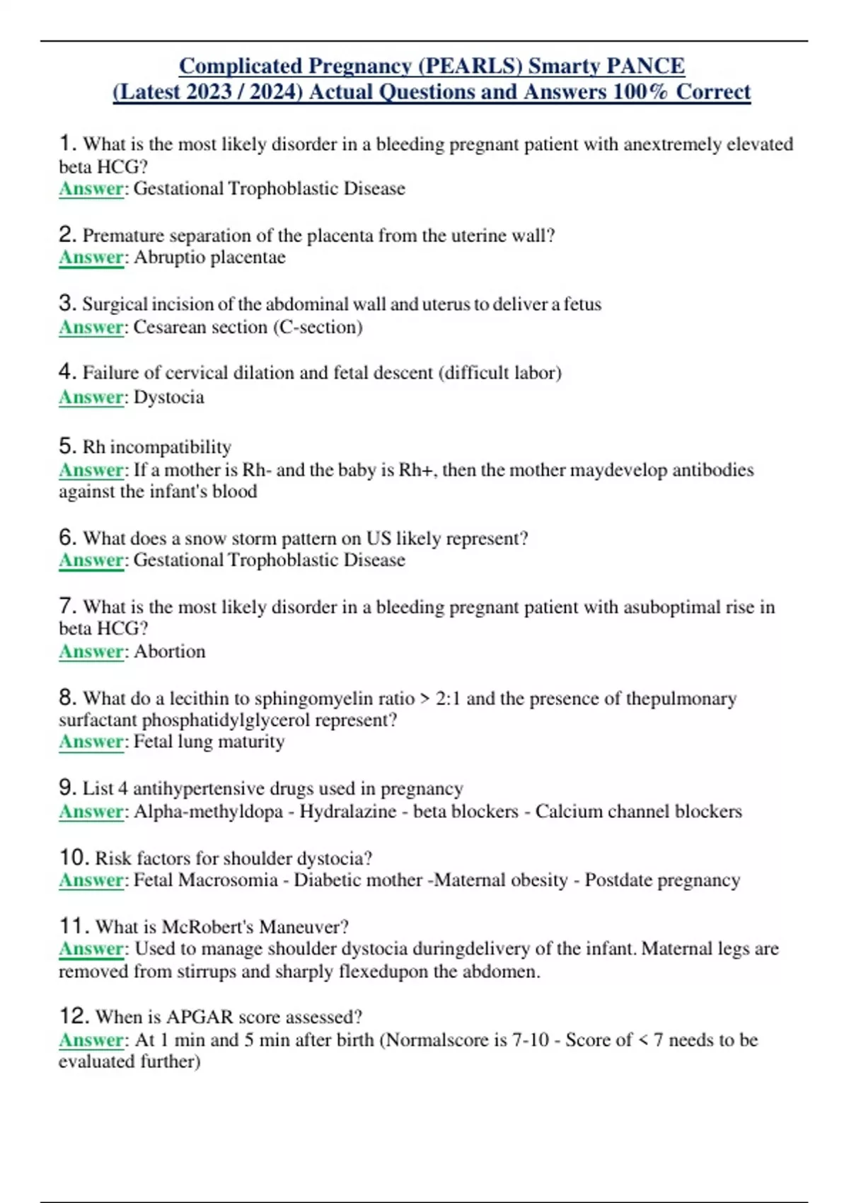 Complicated Pregnancy (PEARLS) Smarty PANCE (Latest 2023 / 2024) Actual Questions and Answers 100% Correct 1. What is the most likely disorder in a bleeding pregnant patient with anextremely elevated beta HCG? Answer: Gestational Trophoblastic Disease 2. Premature separation of the placenta from the uterine wall? Answer: Abruptio placentae 3. Surgical incision of the abdominal wall and uterusto deliver a fetus Answer: Cesarean section (C-section) 4. Failure of cervical dilation and fetal descent (difficult labor) Answer: Dystocia 5. Rh incompatibility Answer: If a mother is Rh- and the baby is Rh+, then the mother maydevelop antibodies against the infant's blood 6. What does a snow storm pattern on US likely represent? Answer: Gestational Trophoblastic Disease 7. What is the most likely disorder in a bleeding pregnant patient with asuboptimal rise in beta HCG? Answer: Abortion 8. What do a lecithin to sphingomyelin ratio 2:1 and the presence of thepulmonary surfactant phosphatidylglycerol represent? Answer: Fetal lung maturity 9. List 4 antihypertensive drugs used in pregnancy Answer: Alpha-methyldopa - Hydralazine - beta blockers - Calcium channel blockers 10. Risk factors for shoulder dystocia? Answer: Fetal Macrosomia - Diabetic mother -Maternal obesity - Postdate pregnancy 11. What is McRobert's Maneuver? Answer: Used to manage shoulder dystocia duringdelivery of the infant. Maternal legs are removed from stirrups and sharply flexedupon the abdomen. 12. When is APGAR score assessed? Answer: At 1 min and 5 min after birth (Normalscore is 7-10 - Score of 7 needs to be evaluated further)