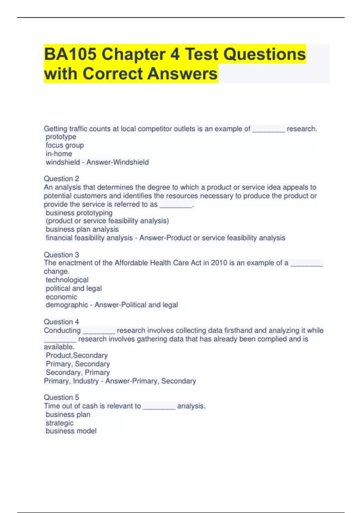 Getting traffic counts at local competitor outlets is an example of ________ research. prototype focus group in-home windshield - Answer-Windshield Question 2 An analysis that determines the degree to which a product or service idea appeals to potential customers and identifies the resources necessary to produce the product or provide the service is referred to as ________. business prototyping (product or service feasibility analysis) business plan analysis financial feasibility analysis - Answer-Product or service feasibility analysis Question 3 The enactment of the Affordable Health Care Act in 2010 is an example of a ________ change. technological political and legal economic demographic - Answer-Political and legal Question 4 Conducting ________ research involves collecting data firsthand and analyzing it while ________ research involves gathering data that has already been complied and is available. Product,Secondary Primary, Secondary Secondary, Primary Primary, Industry - Answer-Primary, Secondary