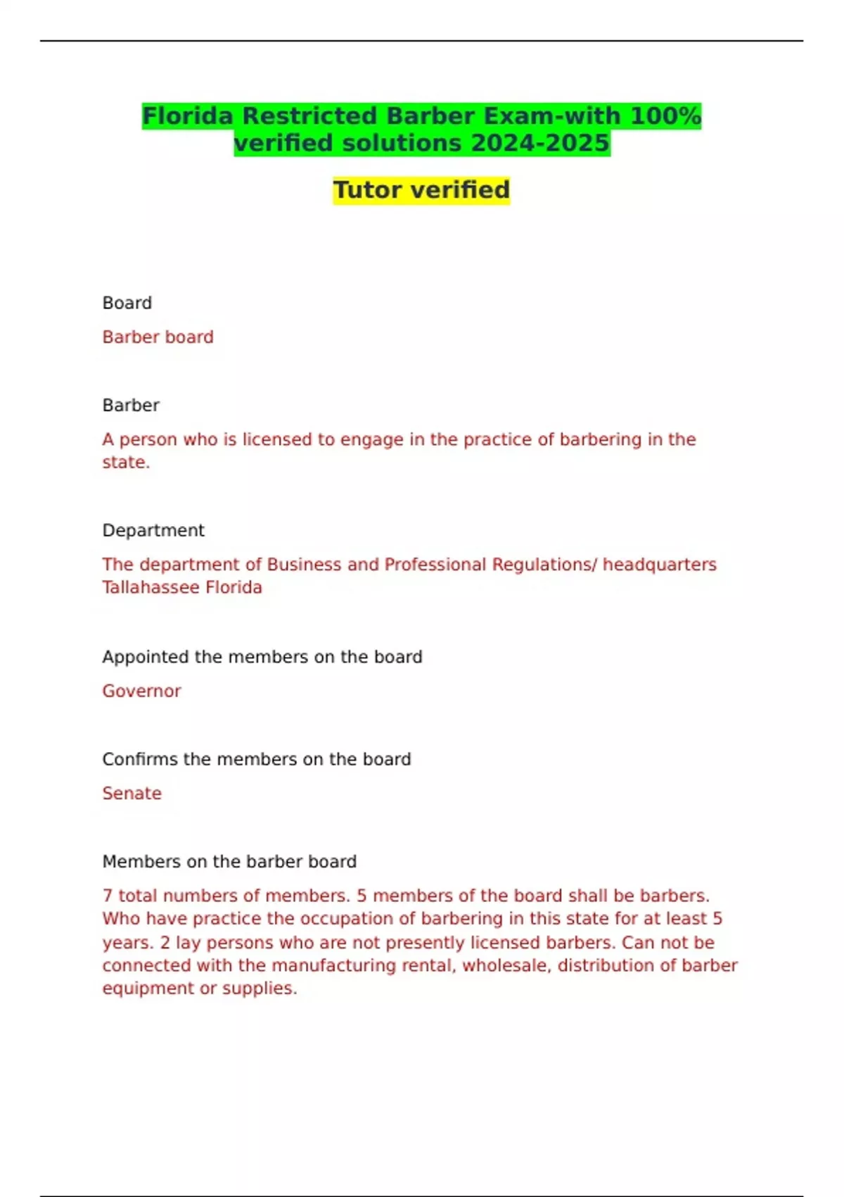 Florida Restricted Barber Exam-with 100% verified solutions