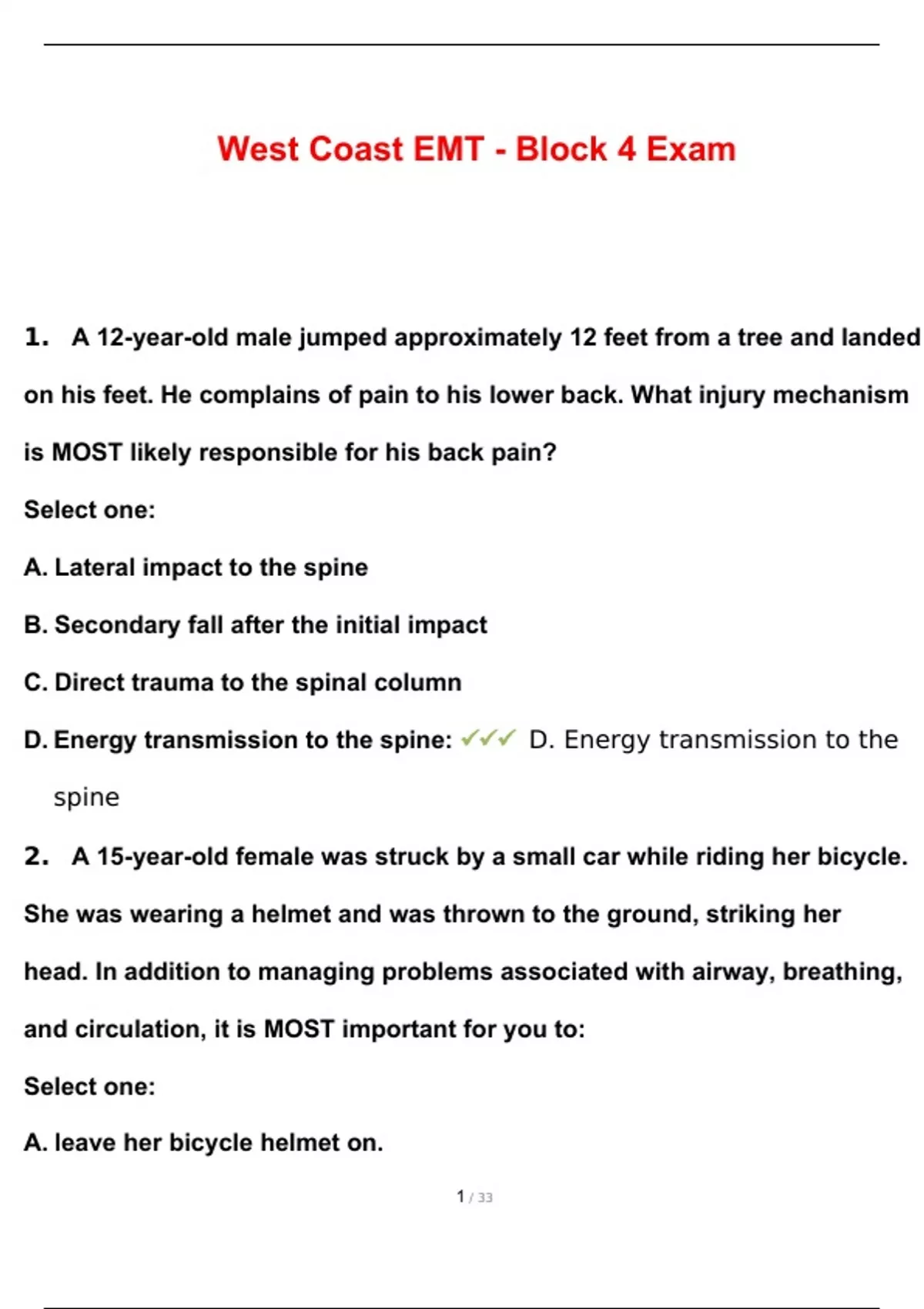 A 12-year-old male jumped approximately 12 feet from a tree and landed on his feet. He complains of pain to his lower back. What injury mechanism is MOST likely responsible for his back pain? Select one: A. Lateral impact to the spine B. Secondary fall after the initial impact C. Direct trauma to the spinal column D. Energy transmission to the spine - D. Energy transmission to the spine A 15-year-old female was struck by a small car while riding her bicycle. She was wearing a helmet and was thrown to the ground, striking her head. In addition to managing problems associated with airway, breathing, and circulation, it is MOST important for you to: Select one: A. leave her bicycle helmet on. B. obtain baseline vital signs. C. stabilize her entire spine. D. inspect the helmet for cracks. - C. stabilize her entire spine. A young male sustained a gunshot wound to the abdomen during an altercation. As your partner is assessing and managing his airway, you should control the obvious bleeding and then: Select one: A. auscultate bowel sounds. B. assess for an exit wound. C. apply a cervical collar. D. obtain baseline vital signs. - B. assess for an exit wound