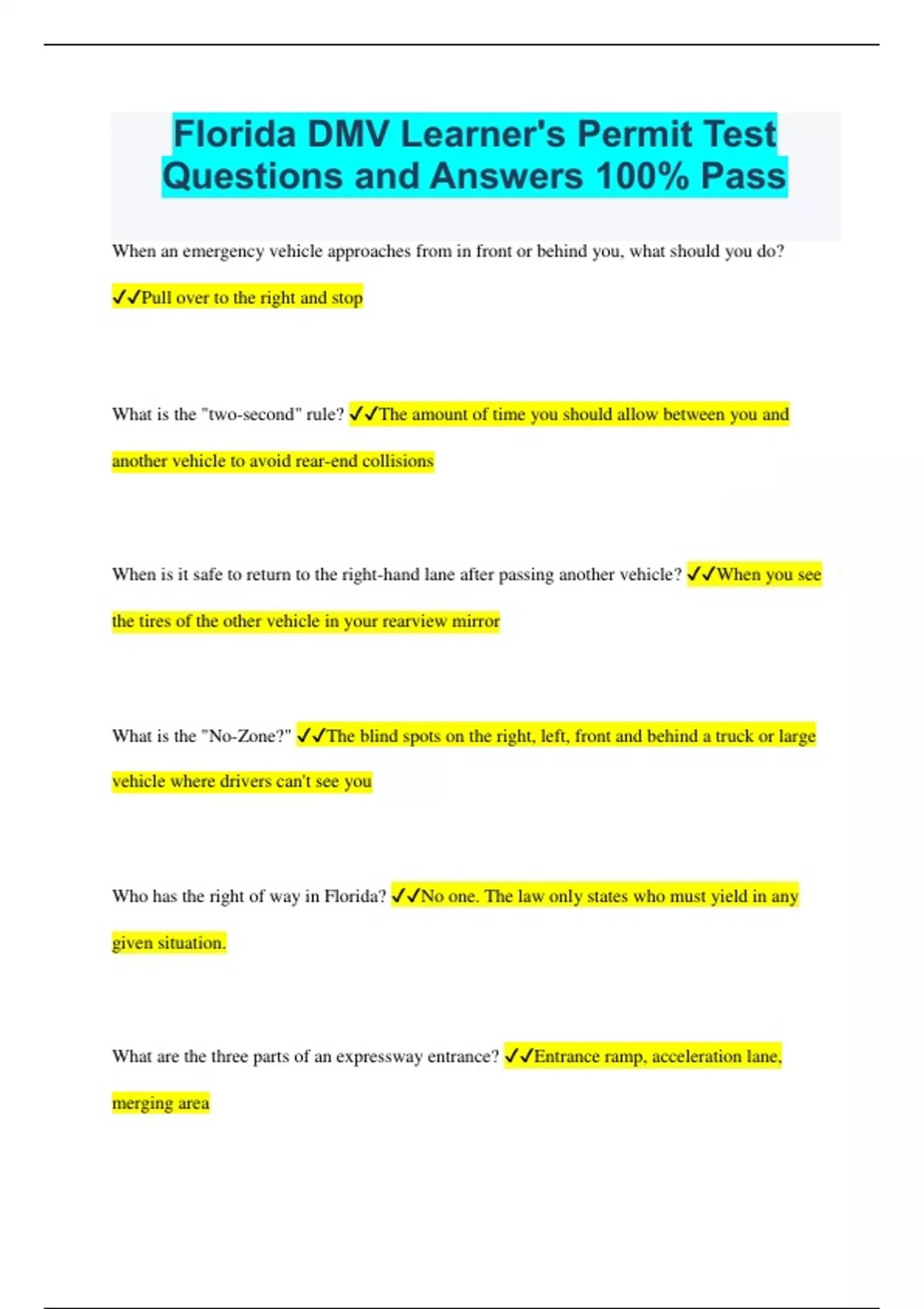 Florida DMV Learner's Permit Test Questions and Answers 100% Pass When an emergency vehicle approaches from in front or behind you, what should you do? Pull over to the right and stop What is the "two-second" rule? The amount of time you should allow between you and another vehicle to avoid rear-end collisions When is it safe to return to the right-hand lane after passing another vehicle? When you see the tires of the other vehicle in your rearview mirror What is the "No-Zone?" The blind spots on the right, left, front and behind a truck or large vehicle where drivers can't see you Who has the right of way in Florida? No one. The law only states who must yield in any given situation.