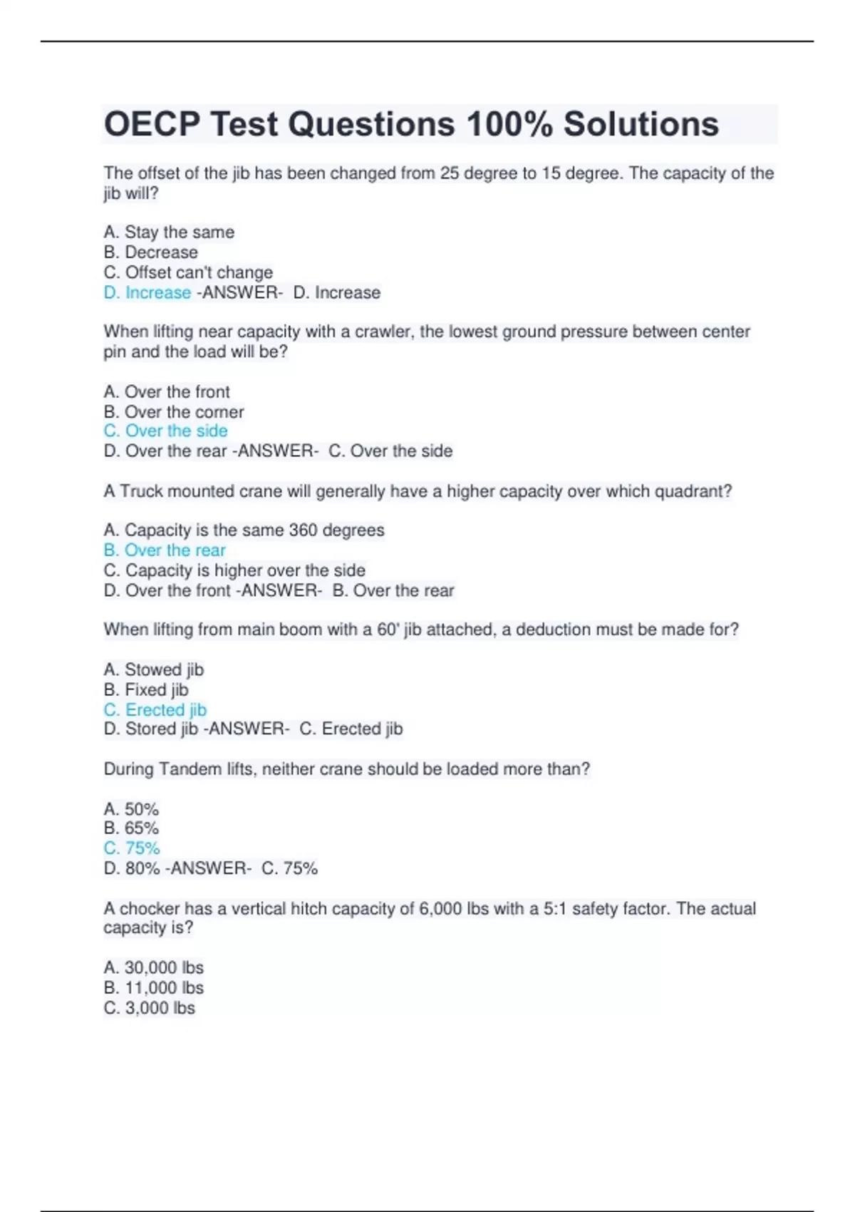 OECP Test Questions 100% Solutions The offset of the jib has been changed from 25 degree to 15 degree. The capacity of the jib will? A. Stay the same B. Decrease C. Offset can't change D. Increase -ANSWER- D. Increase When lifting near capacity with a crawler, the lowest ground pressure between center pin and the load will be? A. Over the front B. Over the corner C. Over the side D. Over the rear -ANSWER- C. Over the side A Truck mounted crane will generally have a higher capacity over which quadrant? A. Capacity is the same 360 degrees B. Over the rear C. Capacity is higher over the side D. Over the front -ANSWER- B. Over the rear When lifting from main boom with a 60' jib attached, a deduction must be made for? A. Stowed jib B. Fixed jib C. Erected jib D. Stored jib -ANSWER- C. Erected jib During Tandem lifts, neither crane should be loaded more than? A. 50% B. 65% C. 75% D. 80% -ANSWER- C. 75% A chocker has a vertical hitch capacity of 6,000 lbs with a 5:1 safety factor. The actual capacity is? A. 30,000 lbs B. 11,000 lbs C. 3,000 lbs D. 6,000 lbs -ANSWER- D. 6,000 lbs Mobile cranes are generally required to be level within? A. 1 degree B. 1% C. 1' D. 1" -ANSWER- B. 1% A power line is rated 330kv, the closest a crane with 150' boom can get without a spotter is? A. 200' B. 20' C. 170' D. 50' -ANSWER- C. 170' ASME recommends, when hoisting personnel, line speeds of A. No more than 100 f/m B. No more than necessary C. No more than 100 f/s D. No speed recommendation -ANSWER- A. No more than 100 f/m Rigging, custom hooks, clamps, spreader beams, etc. Shall be proof tested to ______ of capacity A. 100% B. 125% C. 110% D. 115% -ANSWER- B. 125%