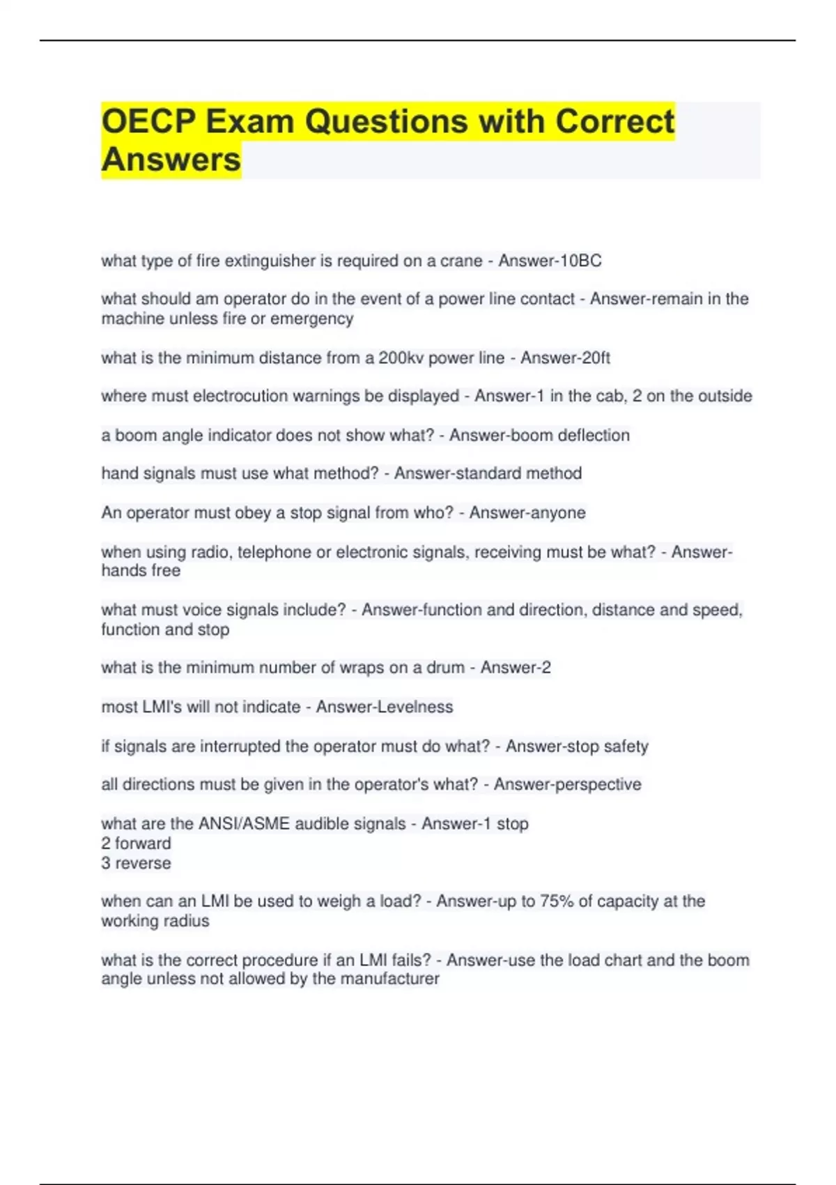 OECP Exam Questions with Correct Answers what type of fire extinguisher is required on a crane - Answer-10BC what should am operator do in the event of a power line contact - Answer-remain in the machine unless fire or emergency what is the minimum distance from a 200kv power line - Answer-20ft where must electrocution warnings be displayed - Answer-1 in the cab, 2 on the outside a boom angle indicator does not show what? - Answer-boom deflection hand signals must use what method? - Answer-standard method An operator must obey a stop signal from who? - Answer-anyone when using radio, telephone or electronic signals, receiving must be what? - Answerhands free what must voice signals include? - Answer-function and direction, distance and speed, function and stop what is the minimum number of wraps on a drum - Answer-2 most LMI's will not indicate - Answer-Levelness if signals are interrupted the operator must do what? - Answer-stop safety all directions must be given in the operator's what? - Answer-perspective what are the ANSI/ASME audible signals - Answer-1 stop 2 forward 3 reverse when can an LMI be used to weigh a load? - Answer-up to 75% of capacity at the working radius what is the correct procedure if an LMI fails? - Answer-use the load chart and the boom angle unless not allowed by the manufacturer