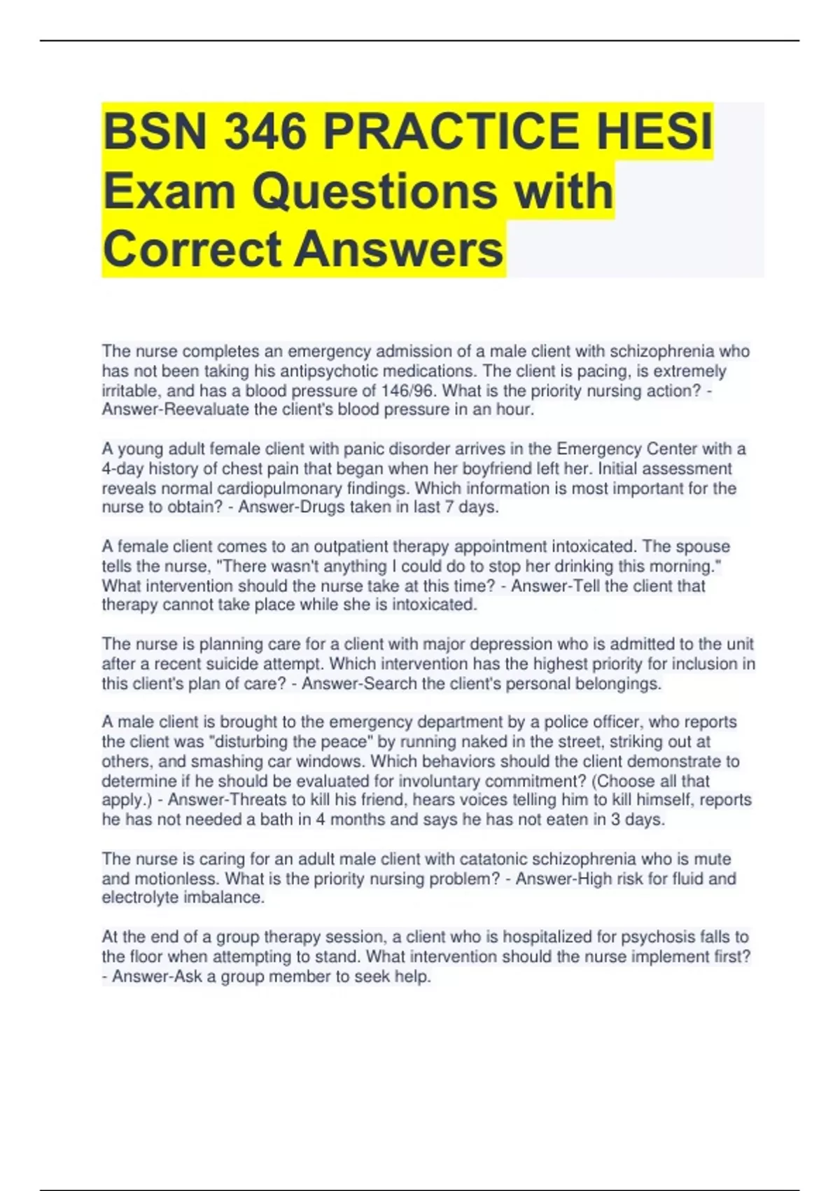 The nurse completes an emergency admission of a male client with schizophrenia who has not been taking his antipsychotic medications. The client is pacing, is extremely irritable, and has a blood pressure of 146/96. What is the priority nursing action? - Answer-Reevaluate the client's blood pressure in an hour. A young adult female client with panic disorder arrives in the Emergency Center with a 4-day history of chest pain that began when her boyfriend left her. Initial assessment reveals normal cardiopulmonary findings. Which information is most important for the nurse to obtain? - Answer-Drugs taken in last 7 days. A female client comes to an outpatient therapy appointment intoxicated. The spouse tells the nurse, "There wasn't anything I could do to stop her drinking this morning." What intervention should the nurse take at this time? - Answer-Tell the client that therapy cannot take place while she is intoxicated. The nurse is planning care for a client with major depression who is admitted to the unit after a recent suicide attempt. Which intervention has the highest priority for inclusion in this client's plan of care? - Answer-Search the client's personal belongings. A male client is brought to the emergency department by a police officer, who reports the client was "disturbing the peace" by running naked in the street, striking out at others, and smashing car windows. Which behaviors should the client demonstrate to determine if he should be evaluated for involuntary commitment? (Choose all that apply.) - Answer-Threats to kill his friend, hears voices telling him to kill himself, reports he has not needed a bath in 4 months and says he has not eaten in 3 days. The nurse is caring for an adult male client with catatonic schizophrenia who is mute and motionless. What is the priority nursing problem? - Answer-High risk for fluid and electrolyte imbalance. At the end of a group therapy session, a client who is hospitalized for psychosis falls to the floor when attempting to stand. What intervention should the nurse implement first? - Answer-Ask a group member to seek help