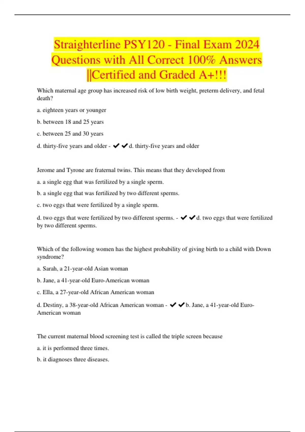Straighterline PSY120 - Final Exam 2024 Questions with All Correct 100% Answers ||Certified and Graded A+!!!