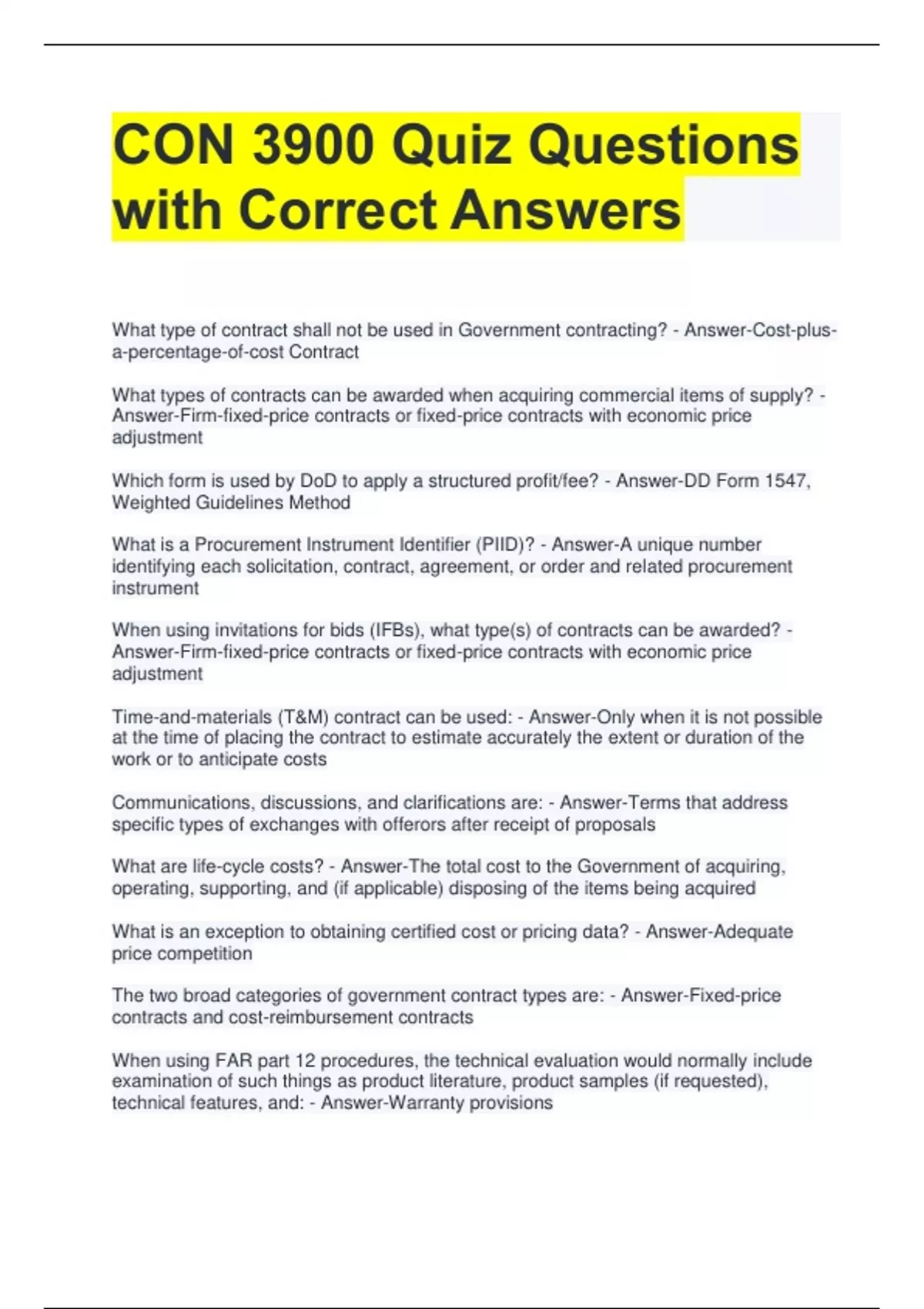 CON 3900 Quiz Questions with Correct Answers What type of contract shall not be used in Government contracting? - Answer-Cost-plusa-percentage-of-cost Contract What types of contracts can be awarded when acquiring commercial items of supply? - Answer-Firm-fixed-price contracts or fixed-price contracts with economic price adjustment Which form is used by DoD to apply a structured profit/fee? - Answer-DD Form 1547, Weighted Guidelines Method What is a Procurement Instrument Identifier (PIID)? - Answer-A unique number identifying each solicitation, contract, agreement, or order and related procurement instrument When using invitations for bids (IFBs), what type(s) of contracts can be awarded? - Answer-Firm-fixed-price contracts or fixed-price contracts with economic price adjustment Time-and-materials (T&M) contract can be used: - Answer-Only when it is not possible at the time of placing the contract to estimate accurately the extent or duration of the work or to anticipate costs Communications, discussions, and clarifications are: - Answer-Terms that address specific types of exchanges with offerors after receipt of proposals What are life-cycle costs? - Answer-The total cost to the Government of acquiring, operating, supporting, and (if applicable) disposing of the items being acquired What is an exception to obtaining certified cost or pricing data? - Answer-Adequate price competition The two broad categories of government contract types are: - Answer-Fixed-price contracts and cost-reimbursement contracts When using FAR part 12 procedures, the technical evaluation would normally include examination of such things as product literature, product samples (if requested), technical features, and: - Answer-Warranty provisions