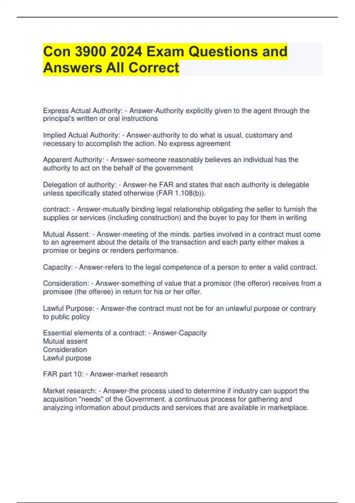Con Exam Questions and Answers All Correct Express Actual Authority: - Answer-Authority explicitly given to the agent through the principal's written or oral instructions Implied Actual Authority: - Answer-authority to do what is usual, customary and necessary to accomplish the action. No express agreement Apparent Authority: - Answer-someone reasonably believes an individual has the authority to act on the behalf of the government Delegation of authority: - Answer-he FAR and states that each authority is delegable unless specifically stated otherwise (FAR 1.108(b)). contract: - Answer-mutually binding legal relationship obligating the seller to furnish the supplies or services (including construction) and the buyer to pay for them in writing Mutual Assent: - Answer-meeting of the minds. parties involved in a contract must come to an agreement about the details of the transaction and each party either makes a promise or begins or renders performance. Capacity: - Answer-refers to the legal competence of a person to enter a valid contract. Consideration: - Answer-something of value that a promisor (the offeror) receives from a promisee (the offeree) in return for his or her offer. Lawful Purpose: - Answer-the contract must not be for an unlawful purpose or contrary to public policy Essential elements of a contract: - Answer-Capacity Mutual assent Consideration Lawful purpose FAR part 10: - Answer-market research Market research: - Answer-the process used to determine if industry can support the acquisition "needs" of the Government. a continuous process for gathering and analyzing information about products and services that are available in marketplace. Market research is conducted to determine: - Answer-if commercial products/services or non-developmental items are available to meet the Government's needs or could be modified to meet the Government's needs (FAR10.002(b)). Strategic market research: - Answer-continuous. overall market developments, trends and capabilities. An example of strategic research is attending a trade show for a specific industry. Tactical Market: - Answer-conducted at specific points during the acquisition process. provides a deeper understanding of the market and answer specific questions about the capabilities, products or services available in the market. Market research can be: - Answer-Strategic or Tactical The Competition in Contracting Act of 1984, (CICA): - Answer-Generally, unless an exception applies or is otherwise expressly authorized by statute, Contracting Officers shall promote and provide for full and open competition in soliciting offers and awarding Government contracts. Competitive Procedures: - Answer-Sealed bids. Competitive proposals Combination of competitive procedures.(e.g., two-step sealed bidding). Other competitive procedures Full and Open Competition: - Answer-With certain limited exceptions contracting officers shall promote and provide for full and open competition in soliciting offers and awarding Government contracts Full and Open Competition After Exclusion of Sources: - Answer-Agencies may exclude a particular source from a contract action in order to establish or maintain an alternative source or sources Exclusion of Sources examples: - Answer-small business Establishing or maintaining alternative sources 8(a Hubzone women-owned small business(EDWOSB) concerns or women-owned small business (WOSB) concerns eligible under the WOSB Program local firms during a major disaster or emergency Other Than Full and Open Competition: - Answer-Contracting without providing for Full and open is authorized under certain conditions with justification Other Than Full and Open Competition Examples: - Answer-Sole Source Unusual and compelling urgency Industrial mobilization; engineering, developmental, or research capability ;or expert services International agreement Authorized or required by statute National security Public Interest Contracting officers shall purchase: - Answer-supplies and services from responsible sources at fair and reasonable prices (FAR15.402 In establishing the reasonableness the contracting officer shall: - Answer-obtain certified cost or pricing data when required shall obtain data other than certified cost or pricing data if certified cost or pricing data are not required Data other than certified cost or pricing data such as: - Answer-market prices, sales to non-governmental and governmental entities rely first on data available within the Government second, on data obtained from sources other than the offeror; and, if necessary, on data obtained from the offeror. Ethics; The general rule is: - Answer-to avoid strictly any conflict of interest or even the appearance of a conflict of interest in government-contractor relationships. Violating compliance rules can subject a contractor to: - Answer-contractual and financial harm, but also potentially to civil monetary penalties and criminal sanctions No Government employee may solicit or accept, directly or indirectly, any gratuity, gift, favor, entertainment, loan, or anything of monetary value from anyone who: - AnswerHas or is seeking to obtain Government business with the employee's agency Conducts activities that are regulated by the employee's agency Has interests that may be substantially affected by the performance or nonperformance of the employee's official duties. Certain limited exceptions are authorized in agency regulations. Acceptance means: - Answer-the act of an authorized representative of the Government acknowledges that the supplies or services conform with applicable contract quality and quantity requirements. Responsibility for Acceptance: - Answer-Acceptance of supplies or services is the responsibility of the Contracting Officer Supplies accepted at a place other than destination shall: - Answer-not be re-inspected at destination for acceptance purposes, but should be examined at destination for quantity, damage in transit, and possible substitutio