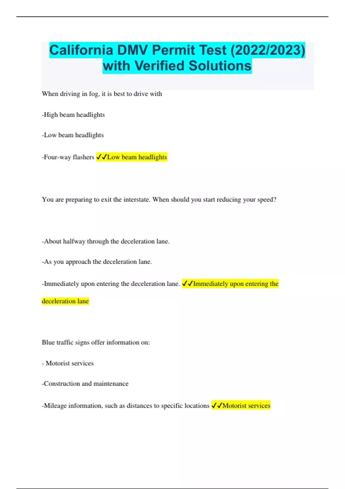 California DMV Permit Test (2022/2023) with Verified Solutions When driving in fog, it is best to drive with -High beam headlights -Low beam headlights -Four-way flashers Low beam headlights You are preparing to exit the interstate. When should you start reducing your speed? -About halfway through the deceleration lane. -As you approach the deceleration lane. -Immediately upon entering the deceleration lane. Immediately upon entering the deceleration lane Blue traffic signs offer information on: - Motorist services -Construction and maintenance -Mileage information, such as distances to specific locations Motorist services