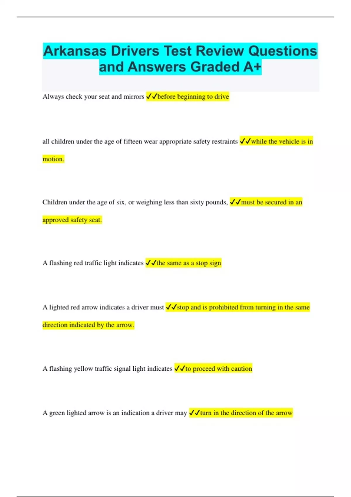 Arkansas Drivers Test Review Questions and Answers Graded A+ Always check your seat and mirrors before beginning to drive all children under the age of fifteen wear appropriate safety restraints while the vehicle is in motion. Children under the age of six, or weighing less than sixty pounds, must be secured in an approved safety seat. A flashing red traffic light indicates the same as a stop sign A lighted red arrow indicates a driver must stop and is prohibited from turning in the same direction indicated by the arrow. A flashing yellow traffic signal light indicates to proceed with caution A green lighted arrow is an indication a driver may turn in the direction of the arrow
