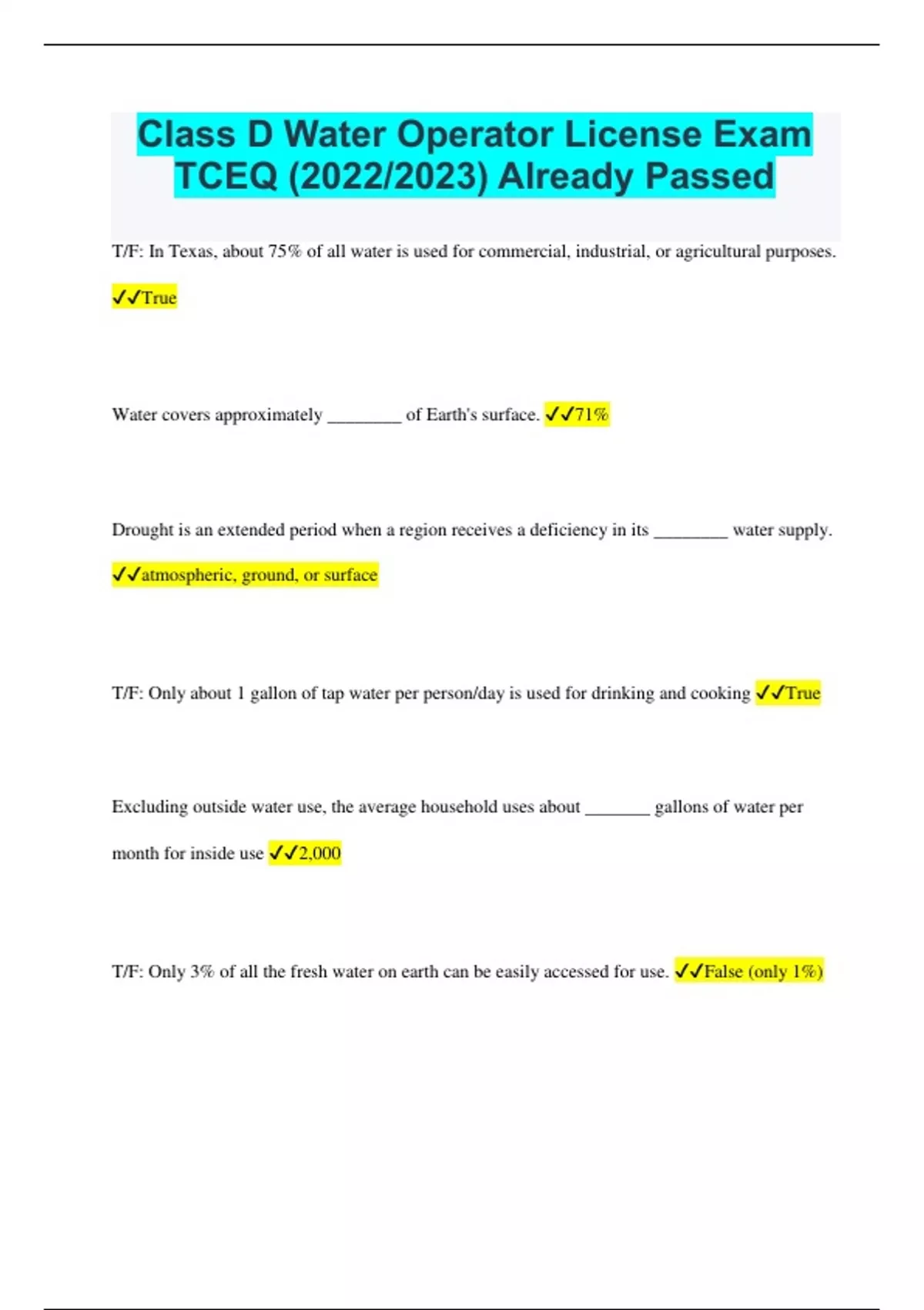 Class D Water Operator License Exam TCEQ (2022/2023) Already Passed T/F: In Texas, about 75% of all water is used for commercial, industrial, or agricultural purposes. True Water covers approximately ________ of Earth's surface. 71% Drought is an extended period when a region receives a deficiency in its ________ water supply. atmospheric, ground, or surface T/F: Only about 1 gallon of tap water per person/day is used for drinking and cooking True Excluding outside water use, the average household uses about _______ gallons of water per month for inside use 2,000 T/F: Only 3% of all the fresh water on earth can be easily accessed for use. False (only 1%)