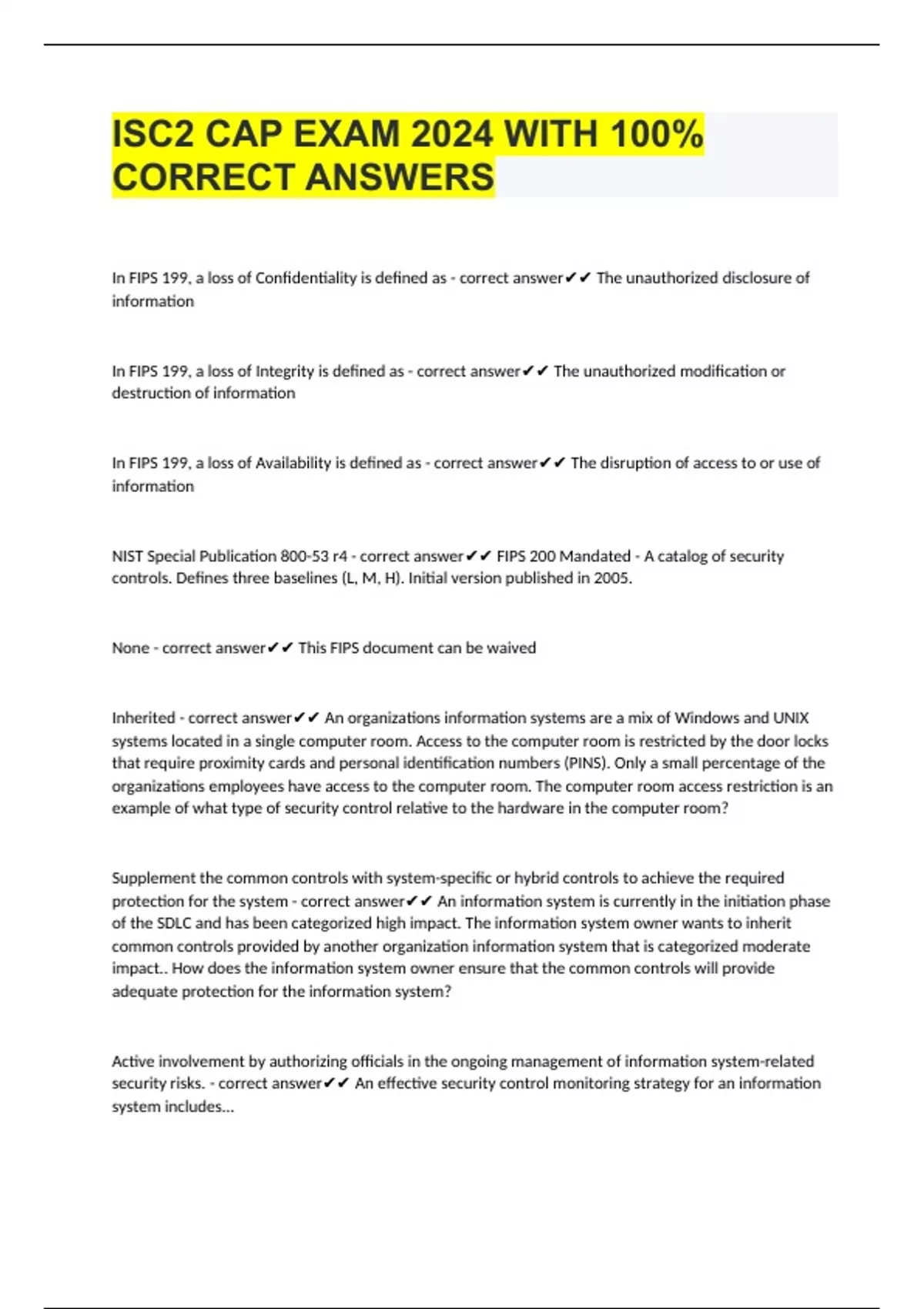 In FIPS 199, a loss of Confidentiality is defined as - correct answer The unauthorized disclosure of information In FIPS 199, a loss of Integrity is defined as - correct answer The unauthorized modification or destruction of information In FIPS 199, a loss of Availability is defined as - correct answer The disruption of access to or use of information NIST Special Publication 800-53 r4 - correct answer FIPS 200 Mandated - A catalog of security controls. Defines three baselines (L, M, H). Initial version published in 2005. None - correct answer This FIPS document can be waived Inherited - correct answer An organizations information systems are a mix of Windows and UNIX systems located in a single computer room. Access to the computer room is restricted by the door locks that require proximity cards and personal identification numbers (PINS). Only a small percentage of the organizations employees have access to the computer room. The computer room access restriction is an example of what type of security control relative to the hardware in the computer room? Supplement the common controls with system-specific or hybrid controls to achieve the required protection for the system - correct answer An information system is currently in the initiation phase of the SDLC and has been categorized high impact. The information system owner wants to inherit common controls provided by another organization information system that is categorized moderate impact.. How does the information system owner ensure that the common controls will provide adequate protection for the information system? Active