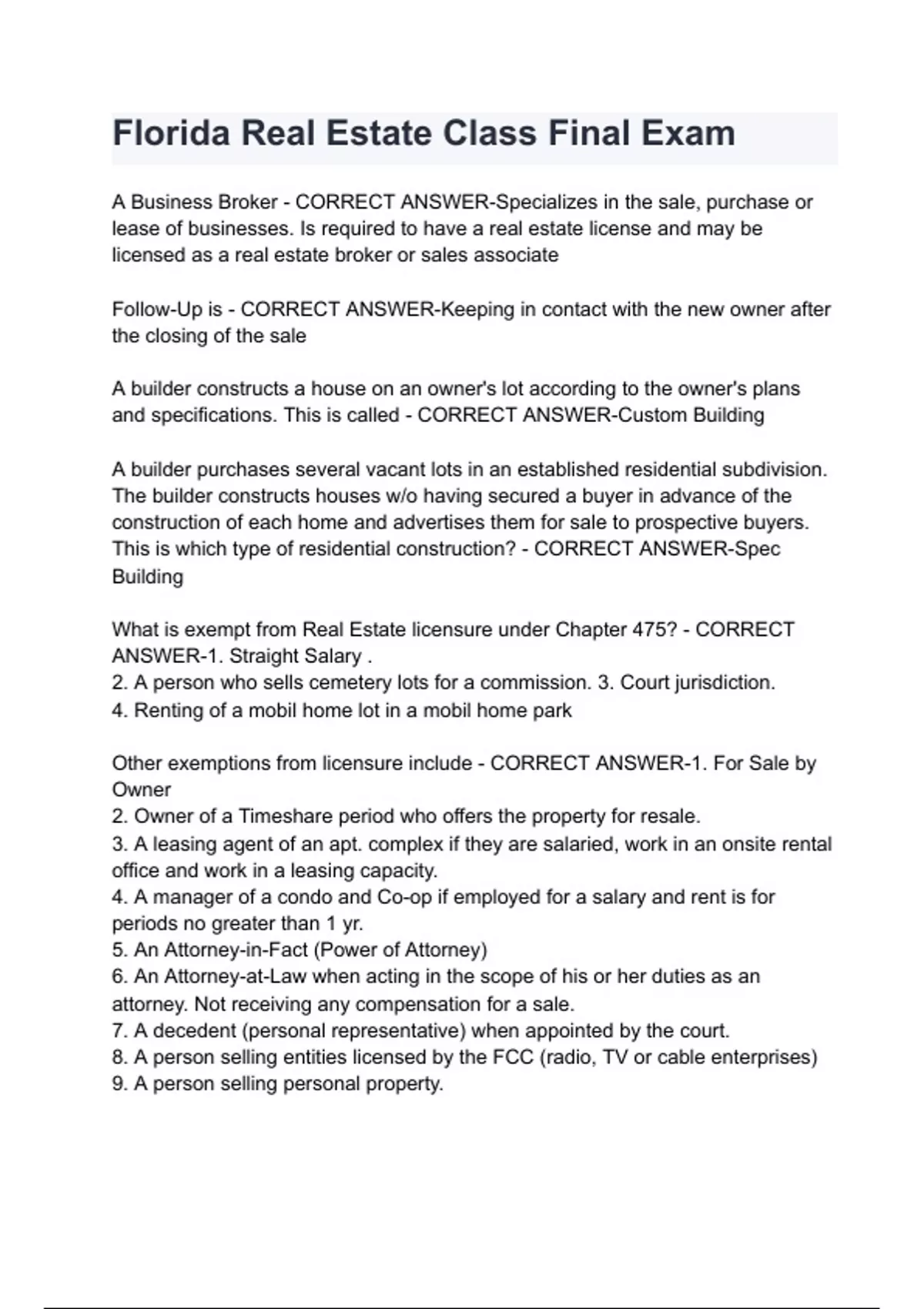 A Business Broker - CORRECT ANSWER-Specializes in the sale, purchase or lease of businesses. Is required to have a real estate license and may be licensed as a real estate broker or sales associate Follow-Up is - CORRECT ANSWER-Keeping in contact with the new owner after the closing of the sale A builder constructs a house on an owner's lot according to the owner's plans and specifications. This is called - CORRECT ANSWER-Custom Building A builder purchases several vacant lots in an established residential subdivision. The builder constructs houses w/o having secured a buyer in advance of the construction of each home and advertises them for sale to prospective buyers. This is which type of residential construction? - CORRECT ANSWER-Spec Building What is exempt from Real Estate licensure under Chapter 475? - CORRECT ANSWER-1. Straight Salary . 2. A person who sells cemetery lots for a commission. 3. Court jurisdiction. 4. Renting of a mobil home lot in a mobil home park Other exemptions from licensure include - CORRECT ANSWER-1. For Sale by Owner 2. Owner of a Timeshare period who offers the property for resale. 3. A leasing agent of an apt. complex if they are salaried, work in an onsite rental office and work in a leasing capacity. 4. A manager of a condo and Co-op if employed for a salary and rent is for periods no greater than 1 yr. 5. An Attorney-in-Fact (Power of Attorney) 6. An Attorney-at-Law when acting in the scope of his or her duties as an attorney. Not receiving any compensation for a sale. 7. A decedent (personal representative) when appointed by the court. 8. A person selling entities licensed by the FCC (radio, TV or cable enterprises) 9. A person sel