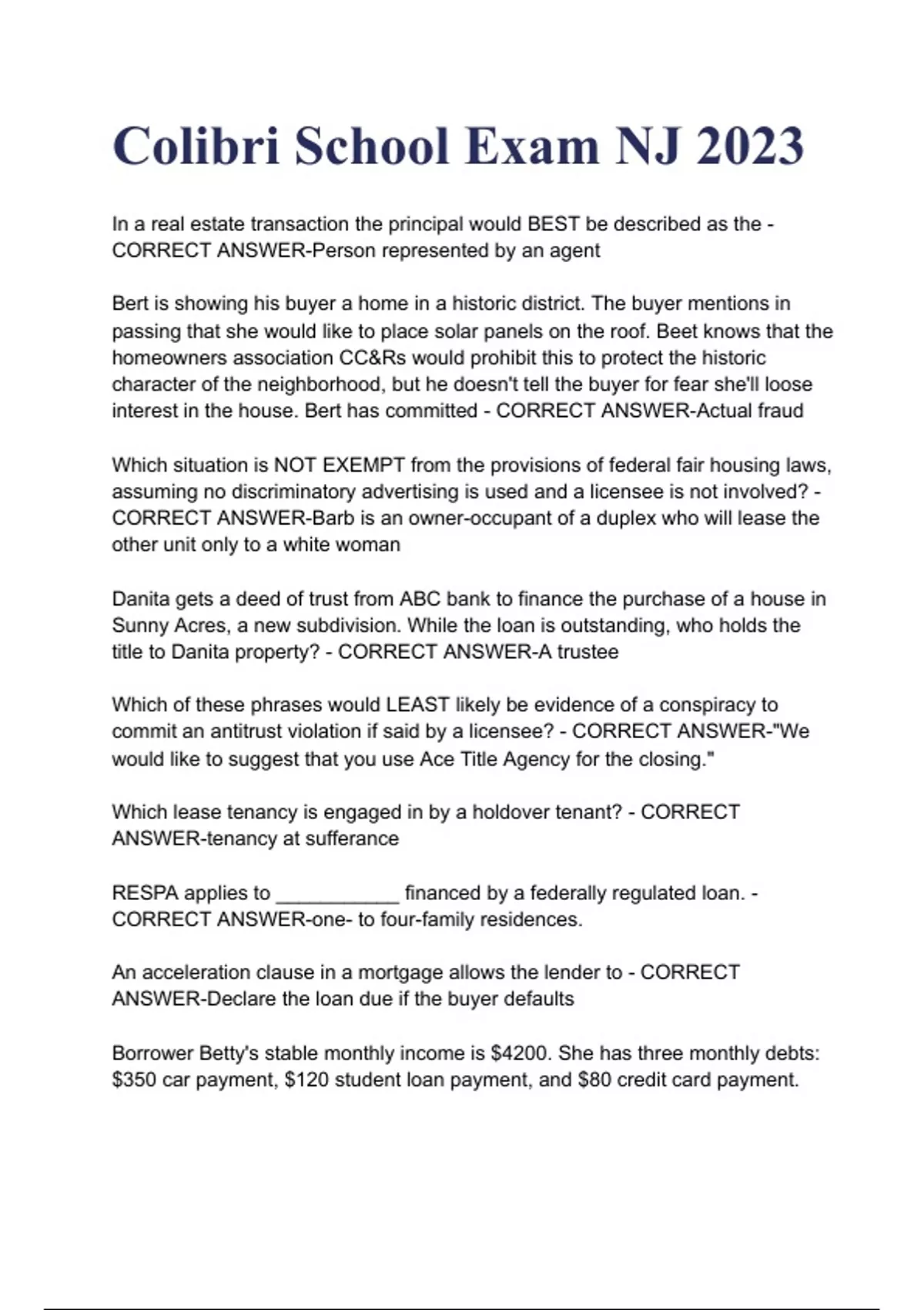 In a real estate transaction the principal would BEST be described as the - CORRECT ANSWER-Person represented by an agent Bert is showing his buyer a home in a historic district. The buyer mentions in passing that she would like to place solar panels on the roof. Beet knows that the homeowners association CC&Rs would prohibit this to protect the historic character of the neighborhood, but he doesn't tell the buyer for fear she'll loose interest in the house. Bert has committed - CORRECT ANSWER-Actual fraud Which situation is NOT EXEMPT from the provisions of federal fair housing laws, assuming no discriminatory advertising is used and a licensee is not involved? - CORRECT ANSWER-Barb is an owner-occupant of a duplex who will lease the other unit only to a white woman Danita gets a deed of trust from ABC bank to finance the purchase of a house in Sunny Acres, a new subdivision. While the loan is outstanding, who holds the title to Danita property? - CORRECT ANSWER-A trustee Which of these phrases would LEAST likely be evidence of a conspiracy to commit an antitrust violation if said by a licensee? - CORRECT ANSWER-"We would like to suggest that you use Ace Title Agency for the closing." Which lease tenancy is engaged in by a holdover tenant? - CORRECT ANSWER-tenancy at sufferance RESPA applies to ___________ financed by a federally regulated loan. - CORRECT ANSWER-one- to four-family residences. An acceleration clause in a mortgage allows the lender to - CORRECT ANSWER-Declare the loan due if the buyer defaults Borrower Betty'