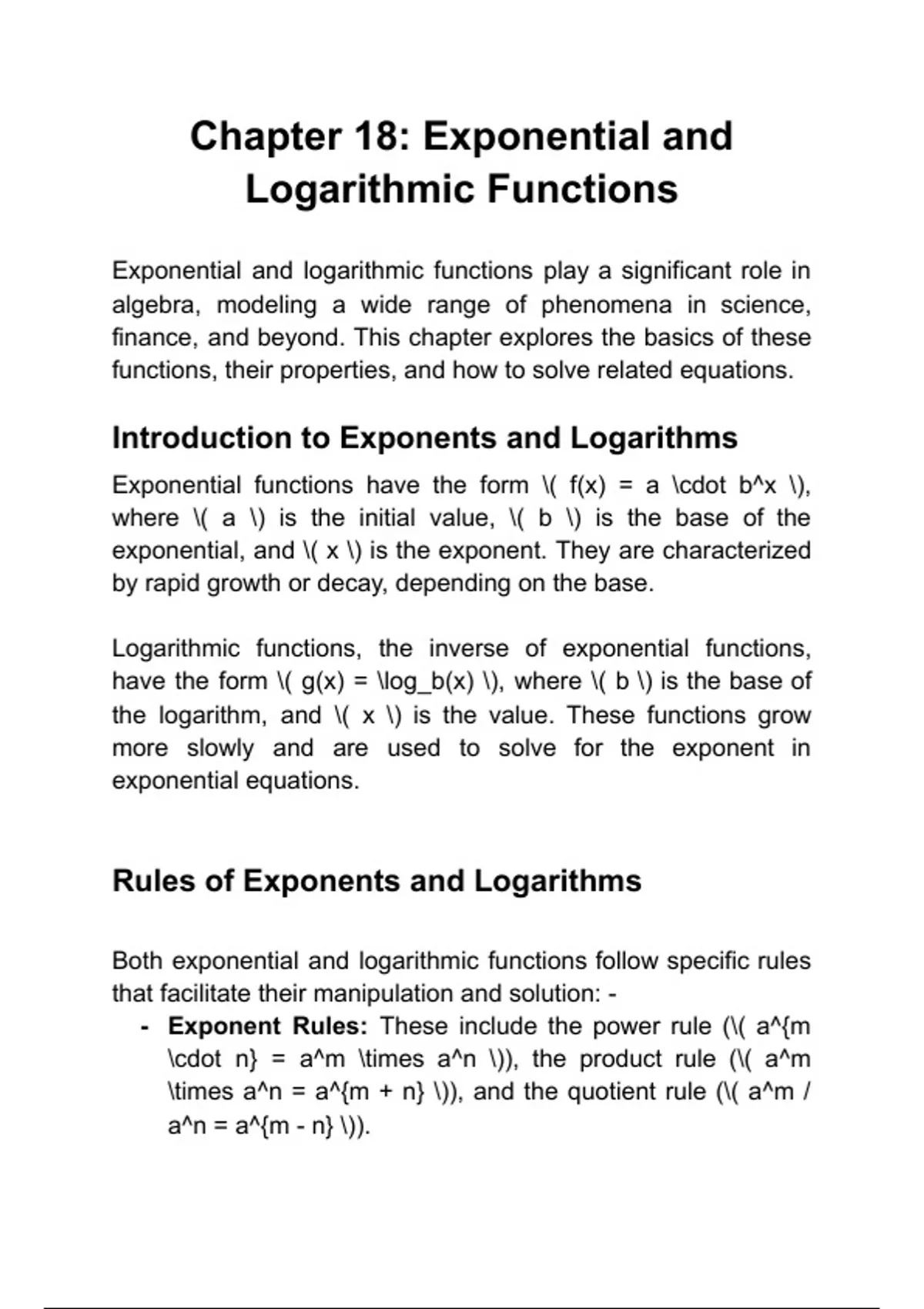 Description: Basics of exponential and logarithmic functions, their rules, and solving related equations.