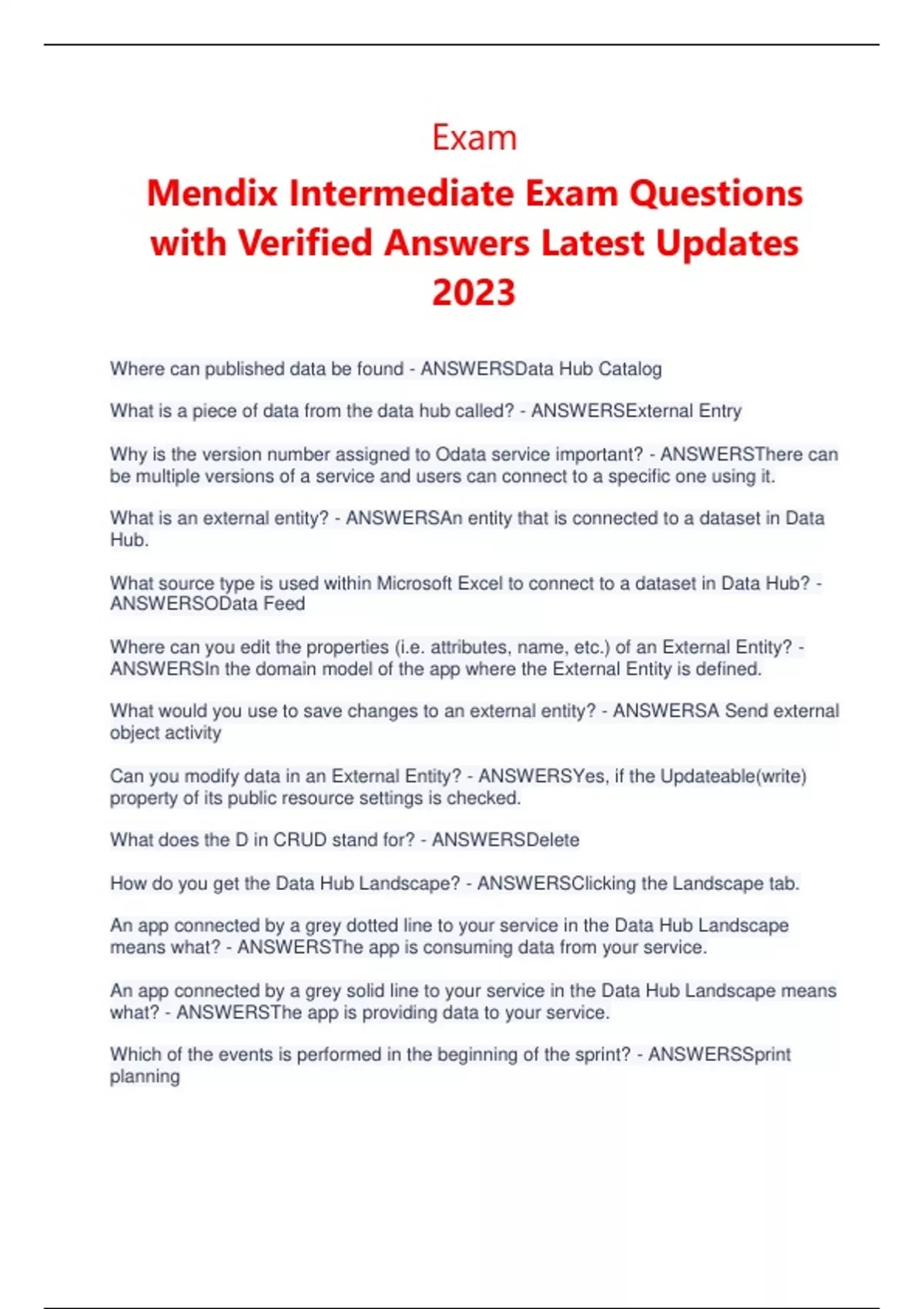 Exam Mendix Intermediate Exam Questions with Verified Answers Latest Updates 2023 Where can published data be found - ANSWERSData Hub Catalog What is a piece of data from the data hub called? - ANSWERSExternal Entry Why is the version number assigned to Odata service important? - ANSWERSThere can be multiple versions of a service and users can connect to a specific one using it. What is an external entity? - ANSWERSAn entity that is connected to a dataset in Data Hub. What source type is used within Microsoft Excel to connect to a dataset in Data Hub? - ANSWERSOData Feed Where can you edit the properties (i.e. attributes, name, etc.) of an External Entity? - ANSWERSIn the domain model of the app where the External Entity is defined. What would you use to save changes to an external entity? - ANSWERSA Send external object activity Can you modify data in an External Entity? - ANSWERSYes, if the Updateable(write) property of its public resource settings is checked. What does the D in CRUD stand for? - ANSWERSDelete How do you get the Data Hub Landscape? - ANSWERSClicking the Landscape tab. An app connected by a grey dotted line to your service in the Data Hub Landscape means what? - ANSWERSThe app is consuming data from your service. An app connected by a grey solid line to your service in the Data Hub Landscape means what? - ANSWERSThe app is providing data to your service. Which of the events is performed in the beginning of the sprint? - ANSWERSSprint planning What happens in the daily scrum? - ANSWERSTeam members share their progress, plans, and issues. Which of the following approaches needs to be used to sort items in the product backlog from top to bottom? - ANSWERSBased on the descending priority. What do Story Points associated with a user story indicate? - ANSWERSEstimation of complexity of a user story. During which of the Sprint Events the development team determines user stories that will be finished in the sprint? - ANSWERSSprint Planning Which folders contain source information tied to a specific module enabling reuse of this module in another project? - ANSWERSJavascriptsource and Javasource folders VerifyP file belonging to the System module is stored in which of the JavaScript sub-folders? - ANSWERSActions M file is stored in which sub-folder of JavaScript directory? - ANSWERSProxies Which of the following sources are typically stored in the Resources folder of the App Directory? - ANSWERSConfiguration files, HTML and Java files Files and folders that together form the styling of your application are typically stored in which of the following folders? - ANSWERSTheme When working in an app with version control, which concept would you use to share your database with your team? Your answer - ANSWERSBy creating a data snapshot and adding it to the deployment directory of your app. What type of conflict occurs when you and your colleague both modified the microflow implementing the delete behavior? - ANSWERSModify-Modify Which of the below listed definitions can be applied to explain what does a tagged version mean? - ANSWERSA revision that has been used to build a Mx deployment package. Which function is used to merge a complete branch into the mainline and is only available on the main line? - ANSWERSMerge feature branch Which of the below mentioned options can be used to merge revisions into and from all lines, main line or branch line? - ANSWERSAdvanced merge Where in Mendix Studio Pro can you configure XPaths? - ANSWERSMicroflow Retrieve actions Which Widget feature utilizes XPaths? - ANSWERSSelectable data constraints on Reference Selectors Where can you utilize XPaths in microflows? - ANSWERSIn the 'Retrieve' action How do you begin typing an XPath? - ANSWERS[ If you want to open the XPath auto-complete menu, you need to press: - ANSWERSCtrl + Space Say you are writing an XPath in a Retrieve action for the VacationRequest entity in a Microflow. If you write in the XPath window [Status = 'Cancelled'], what will be returned? - ANSWERSA list of all the cancelled requests Say you are writing an XPath in a Retrieve action on the VacationRequest entity in a Microflow. If you write in the XPath windo
