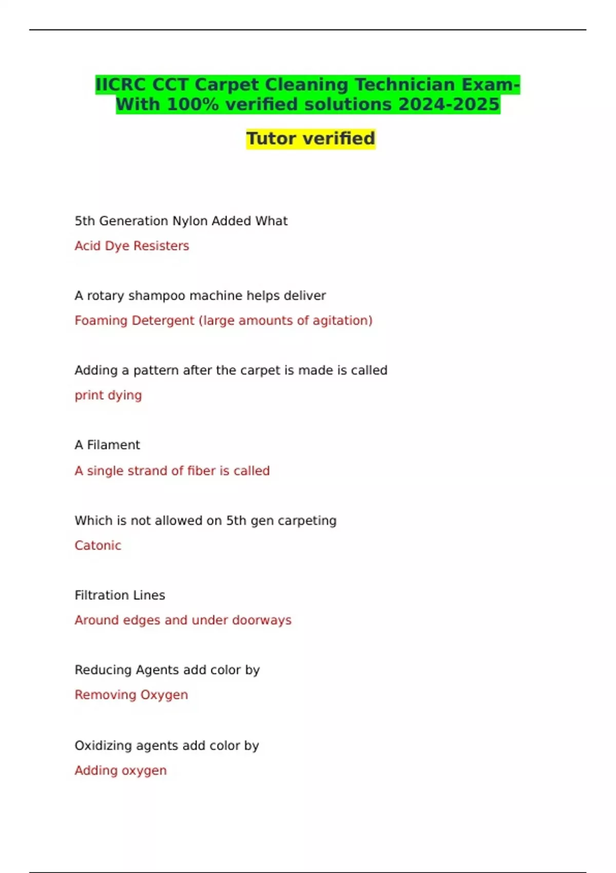 IICRC CCT Carpet Cleaning Technician Exam-With 100% verified solutions