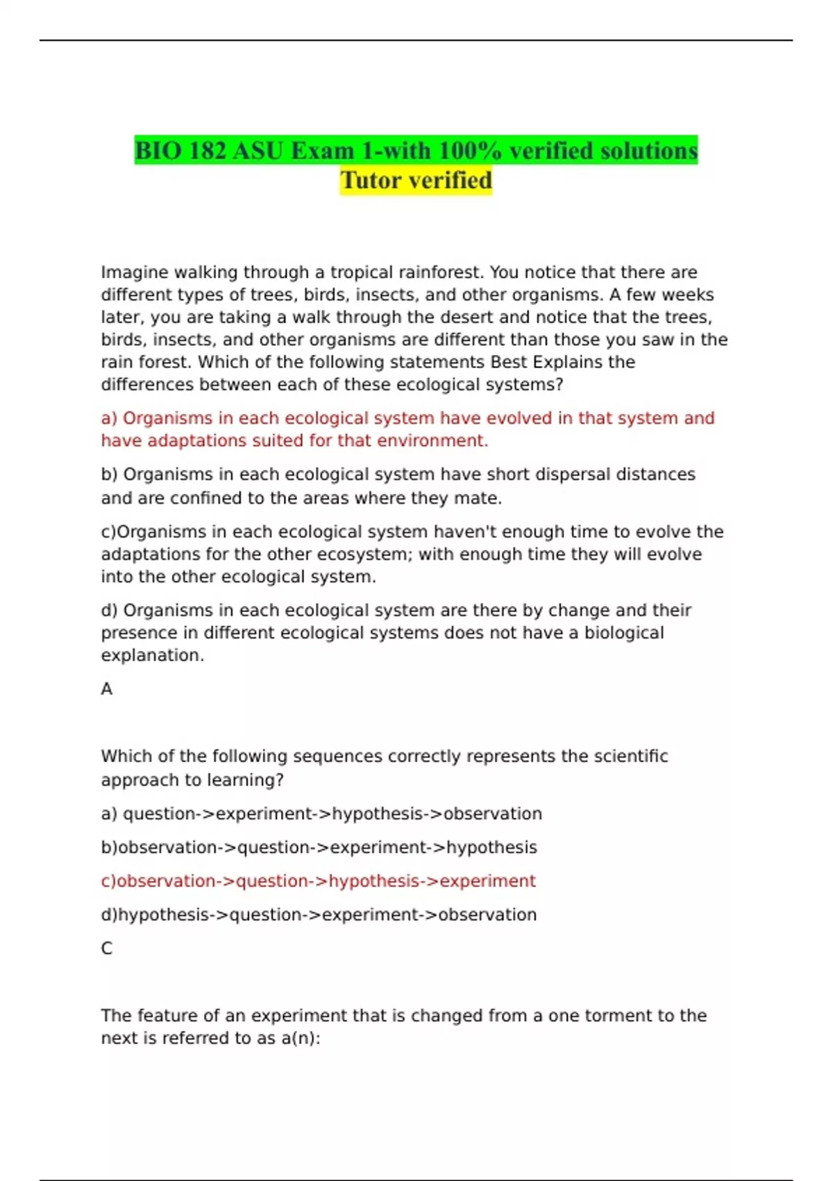 BIO 182 ASU Exam 1-with 100% verified solutions