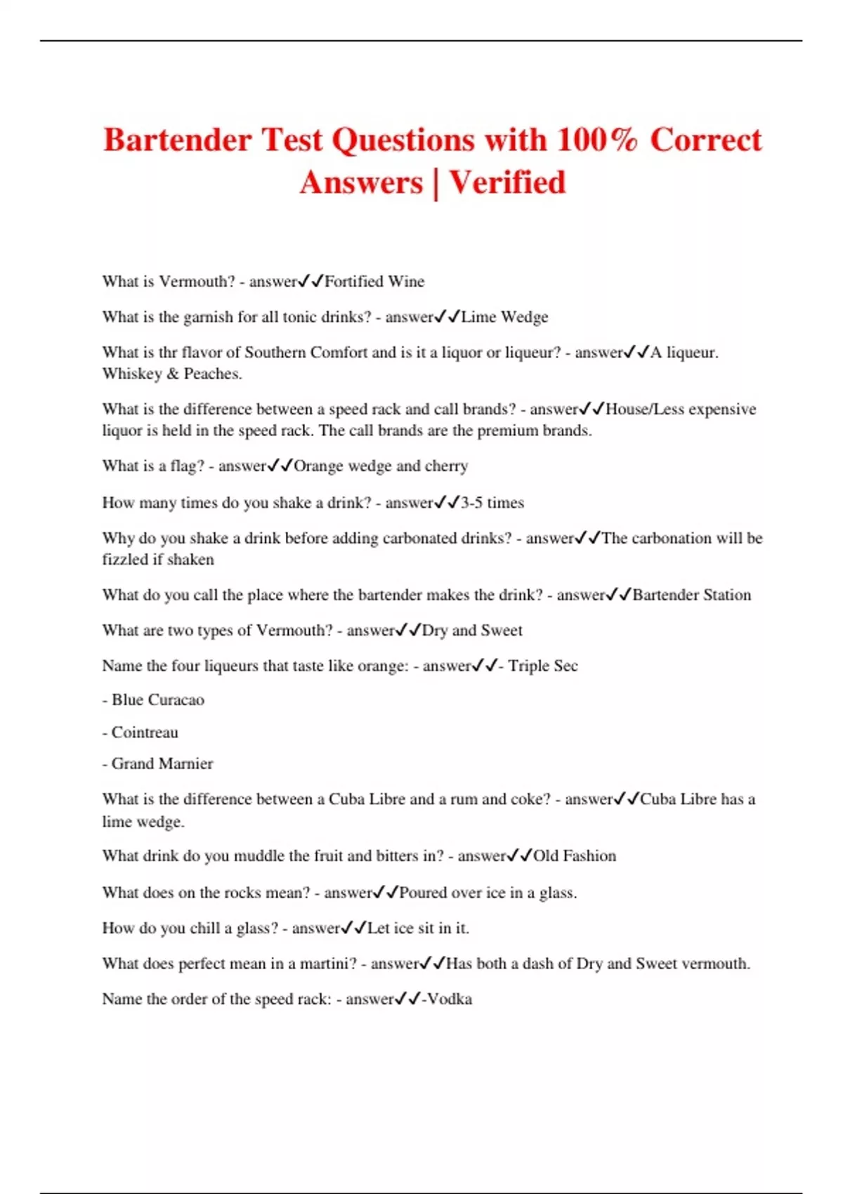 Bartender Test Questions with 100% Correct Answers | Verified What is Vermouth? - answerFortified Wine What is the garnish for all tonic drinks? - answerLime Wedge What is thr flavor of Southern Comfort and is it a liquor or liqueur? - answerA liqueur. Whiskey & Peaches. What is the difference between a speed rack and call brands? - answerHouse/Less expensive liquor is held in the speed rack. The call brands are the premium brands. What is a flag? - answerOrange wedge and cherry How many times do you shake a drink? - answer3-5 times Why do you shake a drink before adding carbonated drinks? - answerThe carbonation will be fizzled if shaken What do you call the place where the bartender makes the drink? - answerBartender Station What are two types of Vermouth? - answerDry and Sweet Name the four liqueurs that taste like orange: - answer- Triple Sec - Blue Curacao - Cointreau - Grand Marnier What is the difference between a Cuba Libre and a rum and coke? - answerCuba Libre has a lime wedge. What drink do you muddle the fruit and bitters in? - answerOld Fashion What does on the rocks mean? - answerPoured over ice in a glass. How do you chill a glass? - answerLet ice sit in it. What does perfect mean in a martini? - answerHas both a dash of Dry and Sweet vermouth. Name the order of the speed rack: - answer-Vodka