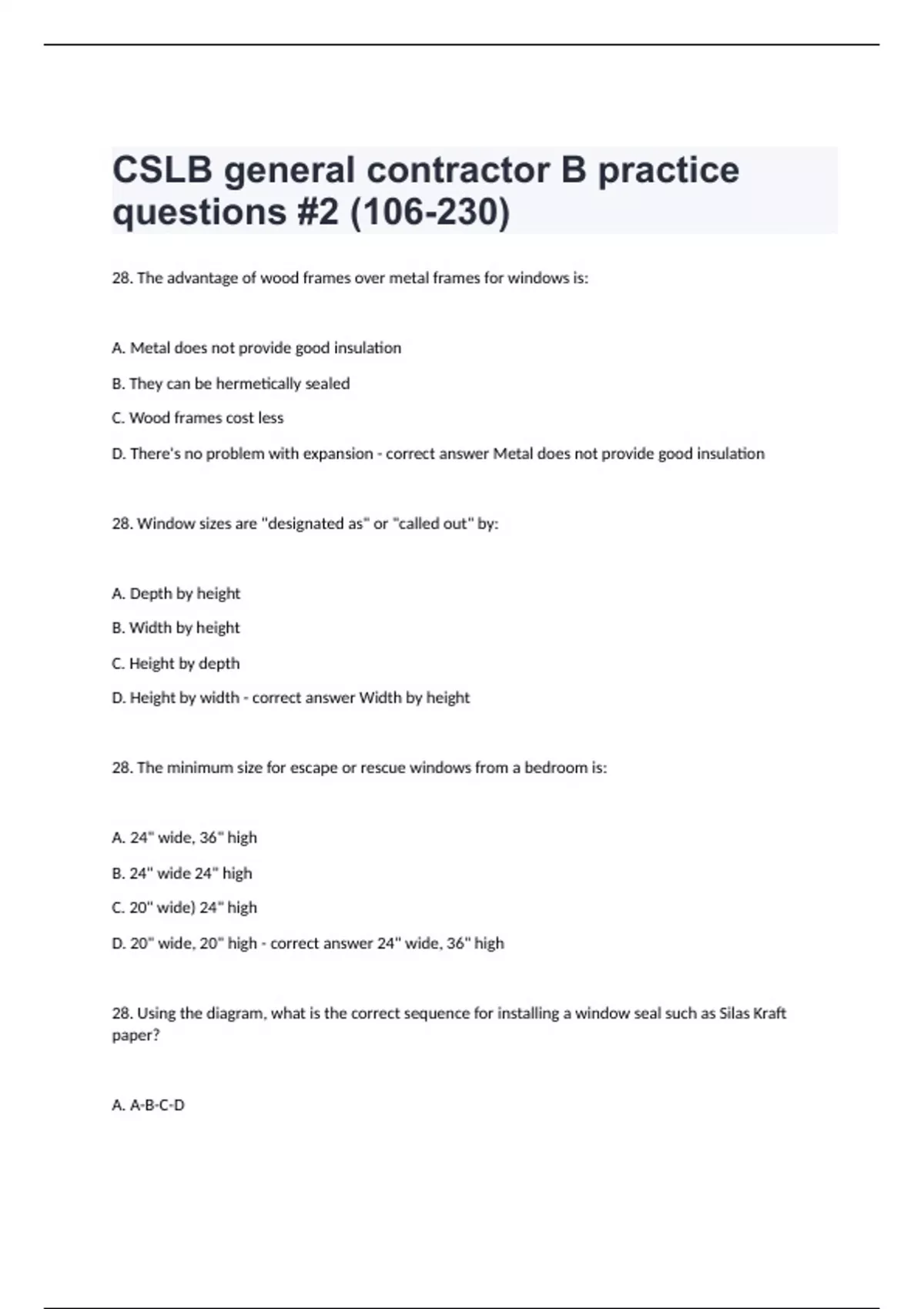 CSLB general contractor B practice questions #2 (106-230)28. The advantage of wood frames over metal frames for windows is: A. Metal does not provide good insulation B. They can be hermetically sealed C. Wood frames cost less D. There's no problem with expansion - correct answer Metal does not provide good insulation 28. Window sizes are "designated as" or "called out" by: A. Depth by height B. Width by height C. Height by depth D. Height by width - correct answer Width by height 28. The minimum size for escape or rescue windows from a bedroom is: A. 24" wide, 36" high B. 24" wide 24" high C. 20" wide) 24" high D. 20" wide, 20" high - correct answer 24" wide, 36" high 28. Using the diagram, what is the correct sequence for installing a window seal such as Silas Kraft paper? A. A-B-C-D