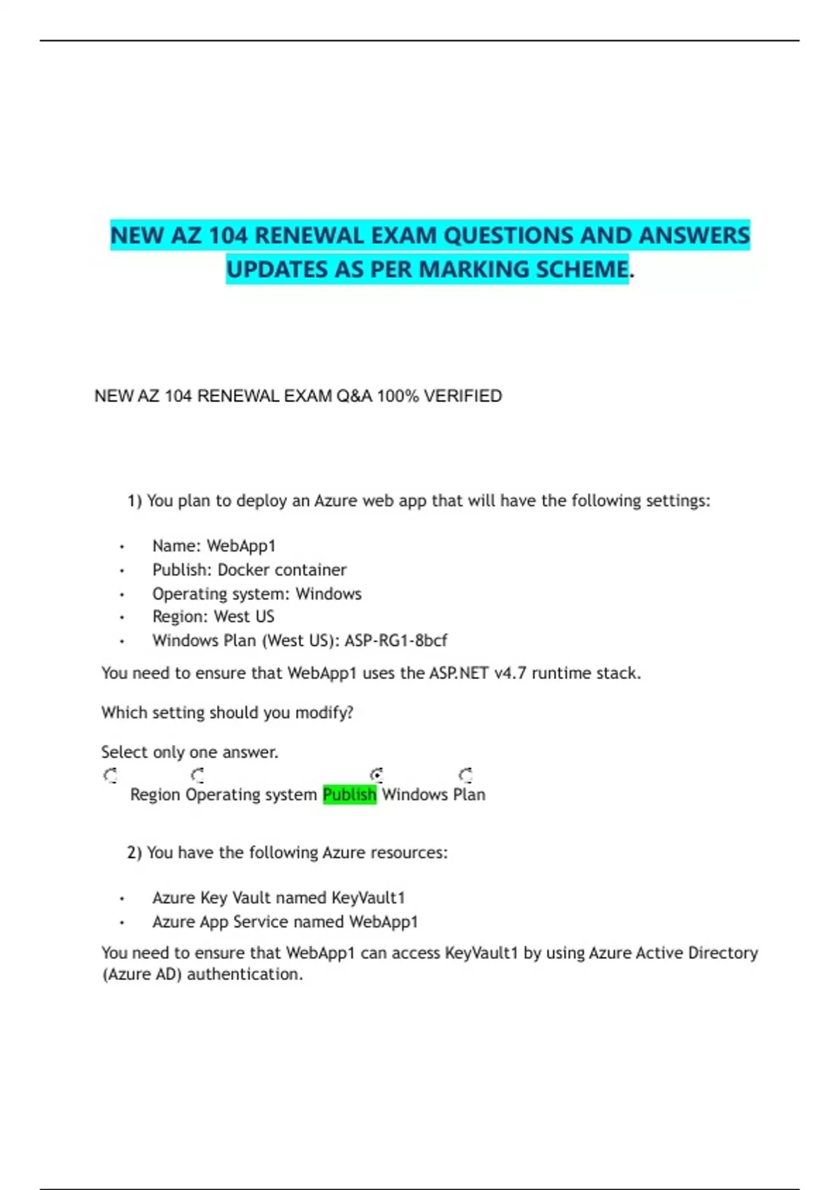 NEW AZ 104 RENEWAL EXAM QUESTIONS AND ANSWERS UPDATES AS PER MARKING SCHEME. NEW AZ 104 RENEWAL EXAM Q&A 100% VERIFIED 1) You plan to deploy an Azure web app that will have the following settings: • Name: WebApp1 • Publish: Docker container • Operating system: Windows • Region: West US • Windows Plan (West US): ASP-RG1-8bcf You need to ensure that WebApp1 uses the ASP.NET v4.7 runtime stack. Which setting should you modify? Select only one answer. Region Operating system Publish Windows Plan 2) You have the following Azure resources: • Azure Key Vault named KeyVault1 • Azure App Service named WebApp1 You need to ensure that WebApp1 can access KeyVault1 by using Azure Active Directory (Azure AD) authentication. Which two settings can be used to configure WebApp1? Each correct answer presents a complete solution. Select all answers that apply. User assigned managed identity Application settings TLS/SSL bindings App Service Authentication System assigned managed identity 3) You have an Azure web app named WebApp1. You discover that backup options are unavailable for WebApp1. RATED GRADE A+ You need to back up WebApp1. What should you do first? Select only one answer. RATED GRADE A+ Modify the platform settings of WebApp1. Modify the Application settings of WebApp1. Scale up the app service plan. Scale out the app service plan. 4) You have an Azure web app named Contoso2023. You add a deployment slot to Contoso2023 named Slot1. You need to be able to perform a deployment slot swap with preview. What should you modify? Select only one answer. application settings for Contoso2023 general settings for Contoso2023 application settings for Contoso2023-Slot1 general settings for Contoso2023-Slot1 5) You plan to create an Azure container instance named container1 that will use a Docker image named Image1. You need to ensure that container1 has persistent storage. Which Azure resources should you deploy for the persistent storage? Select only one answer. an Azure container registry only an Azure Storage account and a file share an Azure Storage account and a blob container an Azure SQL database only 6) You have an Azure container registry named Registry1.